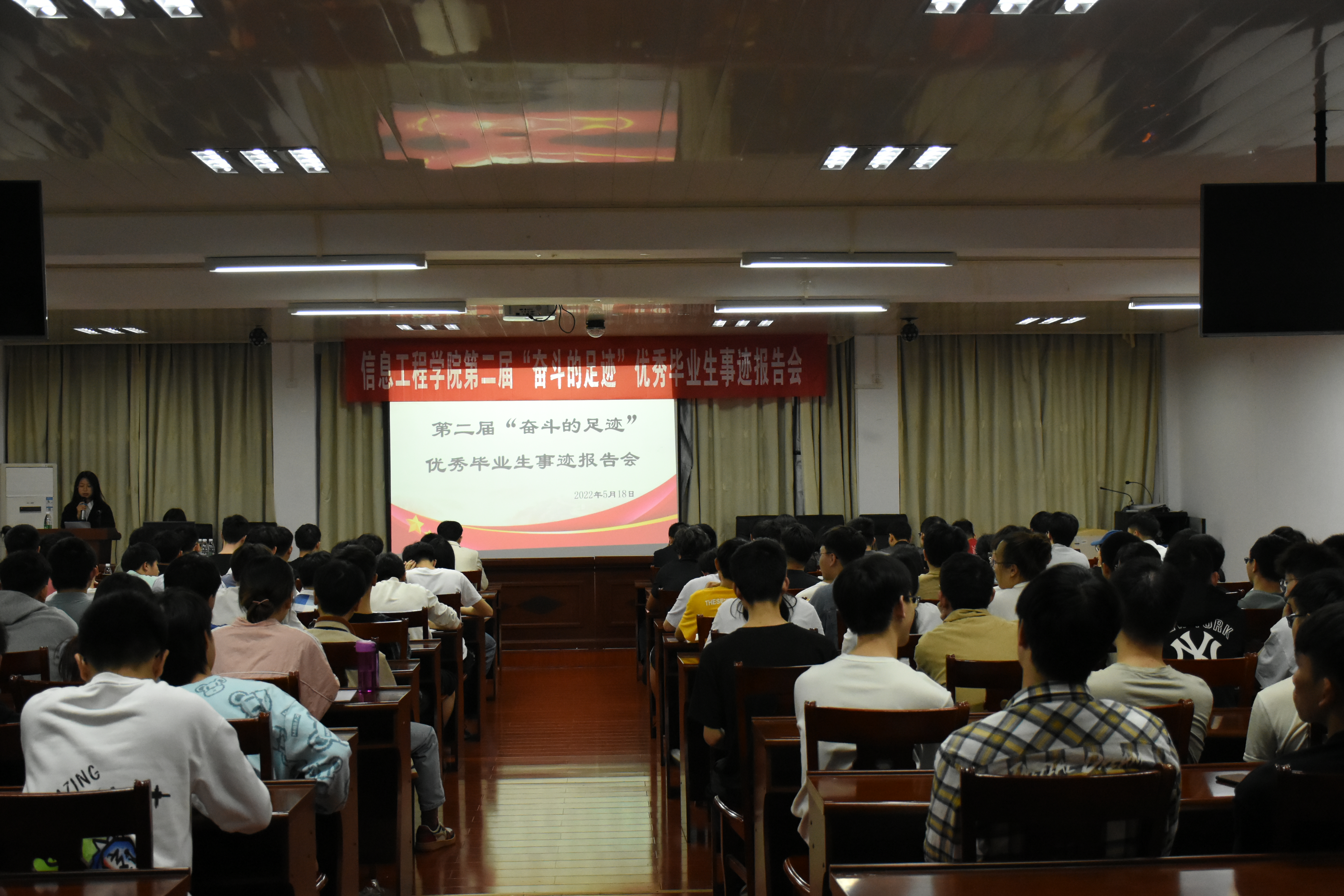 本网讯 5月18日,信息工程学院举办第二届“奋斗的足迹”优秀毕业生事迹报告会。该院党总支副书记夏汉伟、全体辅导员、优秀毕业生代表以及2019级学生参会。