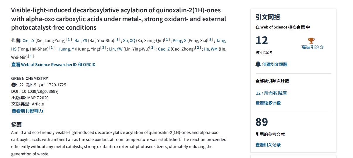 本网讯 根据基本科学指标库ESI(Essential Science Indicators)的最新统计数据,2020年2026世界杯官方合作网站化学与生物工程学院有4篇论文入选了ESI全球TOP1%高被引论文。这4篇高被引论文包括化生院谢龙勇博士以第一作者身份在GREEN CHEMISTRY发表的< >, 化生院刘开建博士以第一作者身份在GREEN CHEMISTRY发表的 < > ,何卫民博士以通讯作者身份在GREEN CHEMISTRY发表的《Visible-light-initiated regioselective sulfonylation/cyclization of 1,6-enynesunder photocatalyst- and additive-free conditions》以及化生院覃佐东博士以并列第一作者在DRUG RESISTANCE UPDATES发表的《Medicinal chemistry strategies to discover P-glycoprotein inhibitors: An update》。