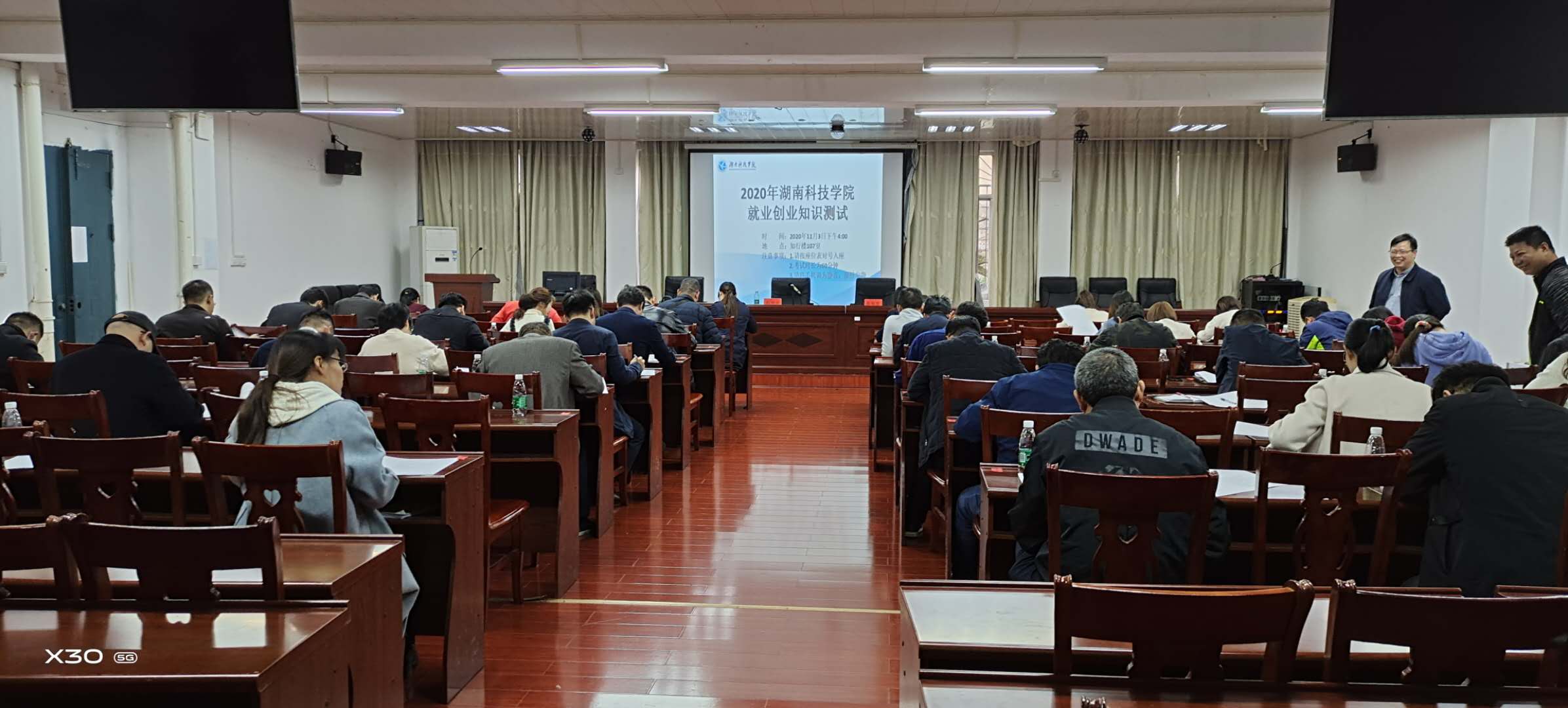 本网讯 11月3日下午,就业创业指导中心在知行楼举办2020年就业创业政策知识竞赛。副校长程智开到场观摩,各教学学院党总支书记、就业创业专干、就业创业指导中心全体工作人员等参加竞赛。