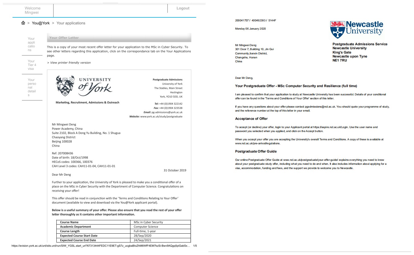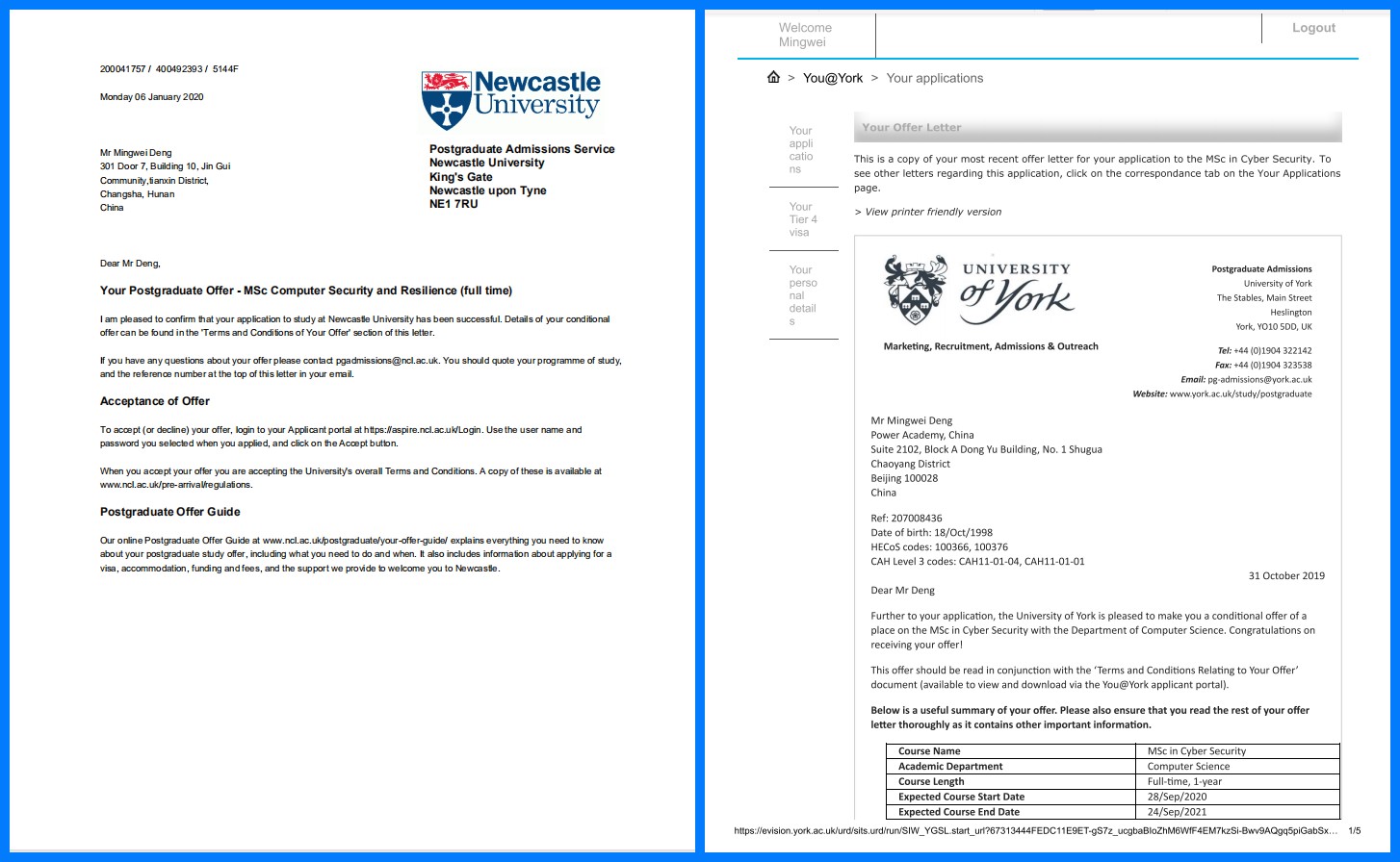 本网讯 近日,世界杯官网电子与信息工程学院软件1601班的邓铭巍同学同时收到了来自英国约克大学和纽卡斯尔大学的研究生录取通知书。