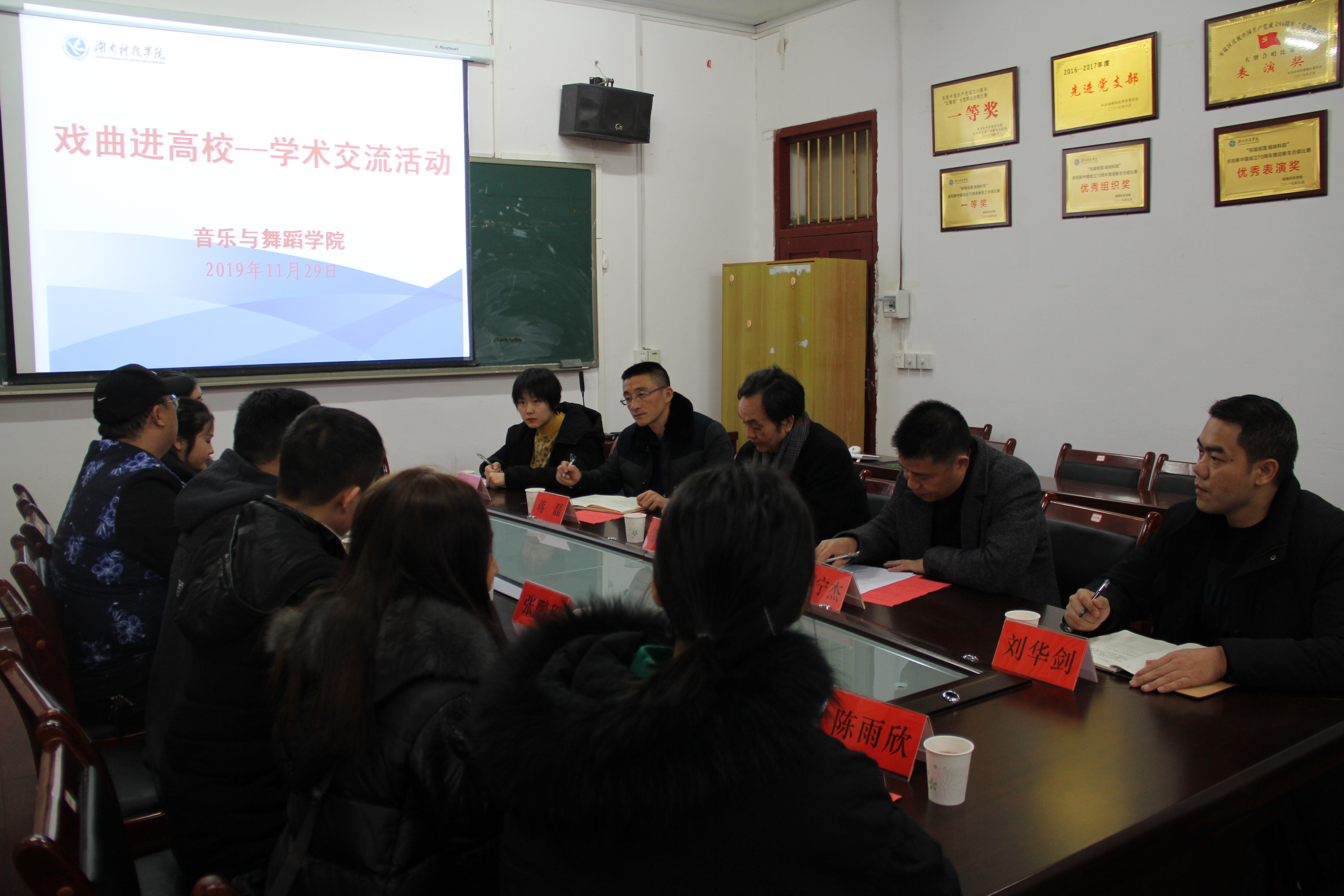 本网讯 11月29日下午,音乐与舞蹈学院在荟英楼举行戏曲进高校学术交流活动。祁阳祁剧团团长郑安顺,该院院长邹林波、党总支书记廖宁杰参加活动。