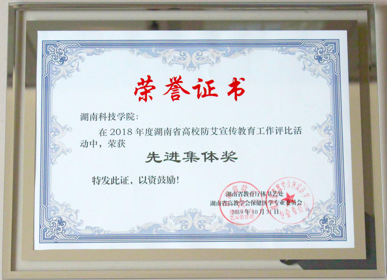 本网讯 10月31日,由湖南省高校保健医学专业委员会主办的湖南省高校保健医学会2019年年会在长沙卫生职业学院召开,会上颁发了2018年度湖南省高校防艾宣传教育工作评比活动有关奖项,世界杯官网荣获“先进集体奖”。
