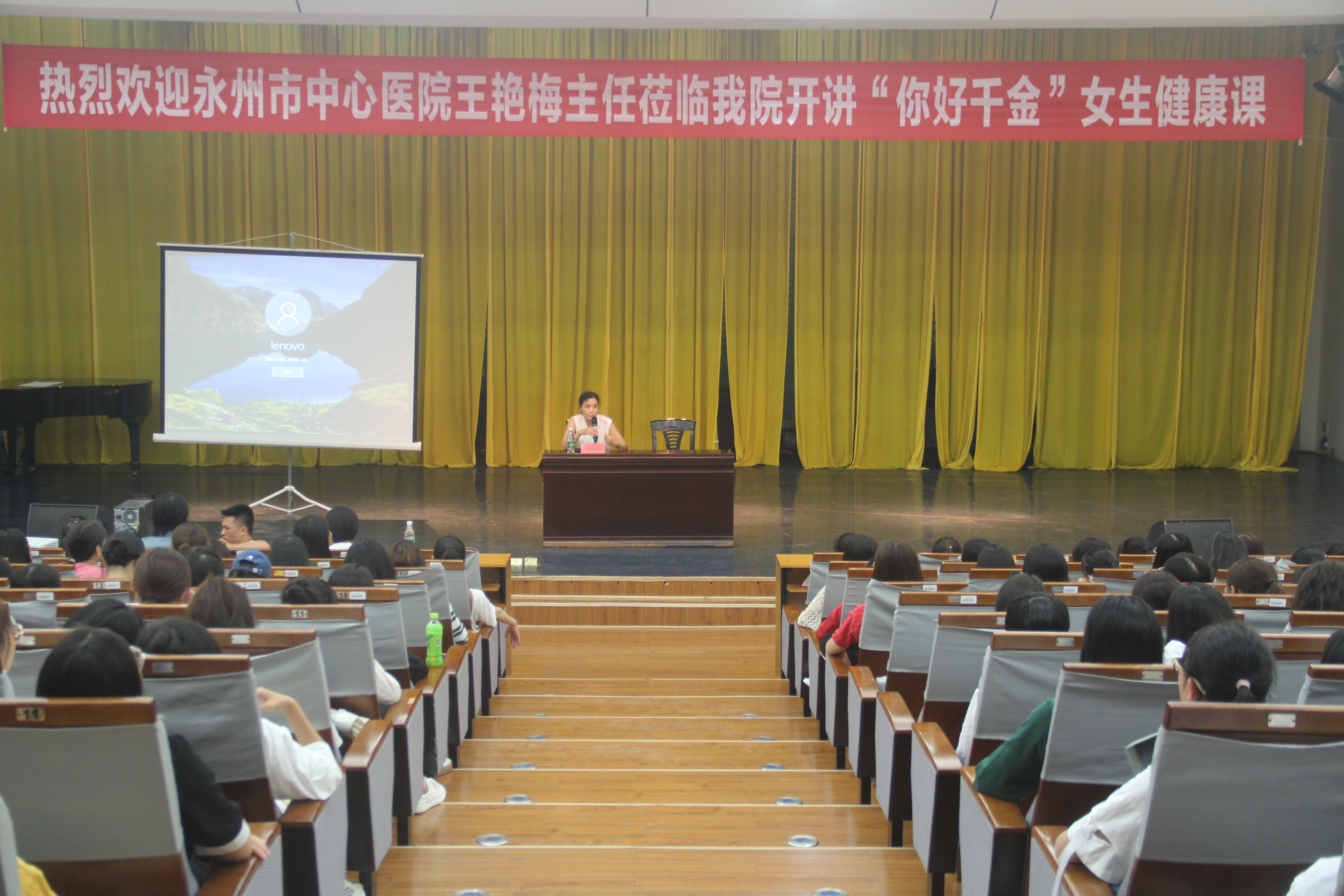 本网讯 9月17日晚,音乐与舞蹈学院举行“你好,千金”女性健康公益讲座。讲座特邀永州市中心医院妇产科主任医师王艳梅作为主讲嘉宾。音乐与舞蹈学2019级全体女生及马克思主义学院2019级女生聆听了本次讲座。