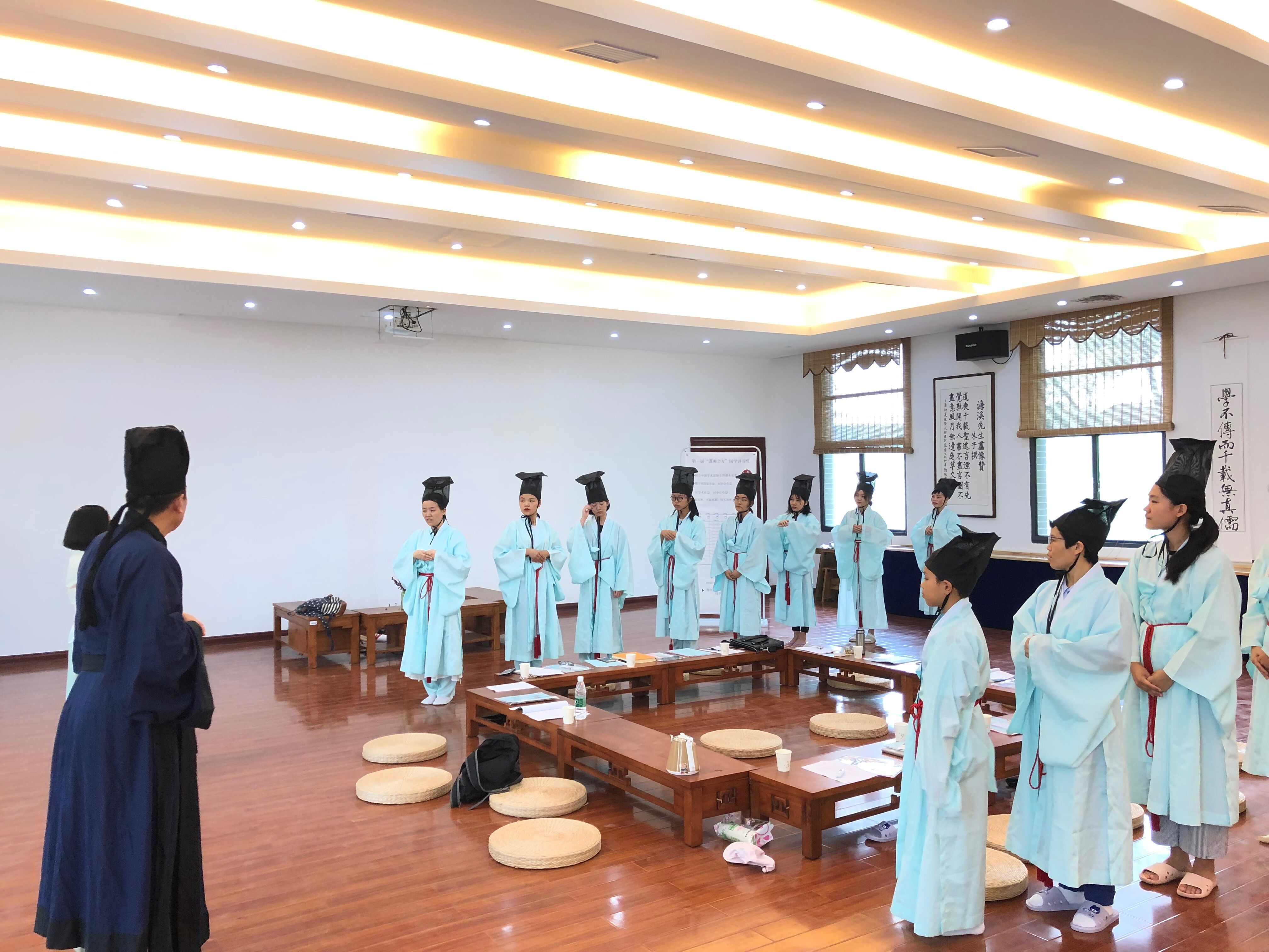 8月9日上午,来自四面八方的朋友同着汉服,在2026世界杯官方合作网站国学院小成堂进行了师生相见礼,代表着为期七天的第一届“潇湘会友”国学讲习班正式开班。参加此次讲习活动的成员有大学教师、研究生、大学生、中学生乃至小学生,并有学生家长及公务员旁听。