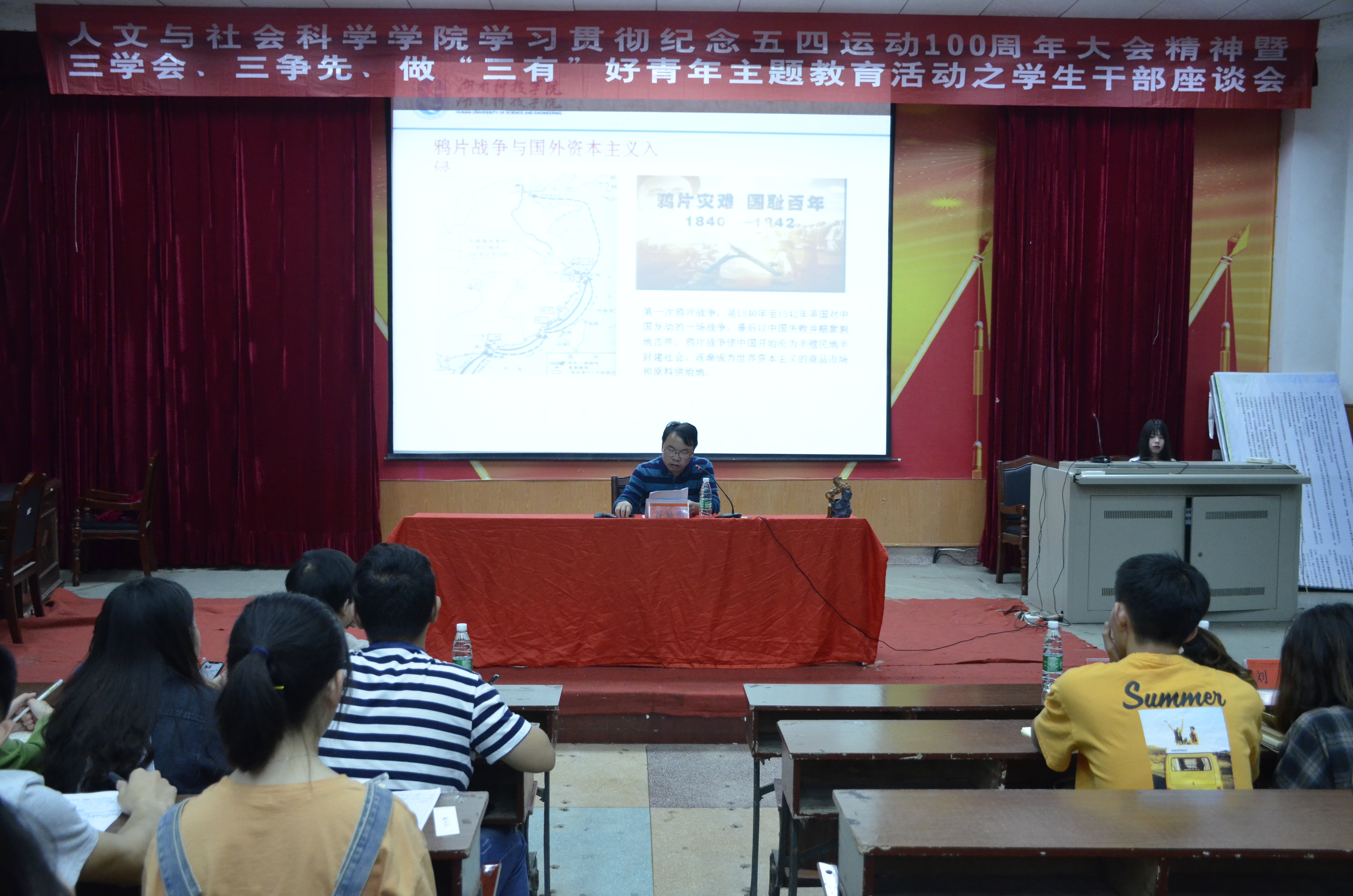 人文与社会科学学院召开学生干部学习座谈会,学习习总书记在纪念五四运动100周年大会上的讲话精神。该院党总支书记谷显明为大家作了题为“弘扬五四精神,担当时代重任”的学习辅导报告,全面深入地阐述了五四运动的伟大意义,特别就习总书记提出的“六个要求”与学生干部进行了交流。他希望学生干部要敢于担当、要具有家国情怀,将个人的发展与国家民族的命运结合起来,做一名有理想、有本领、有担当的好青年。