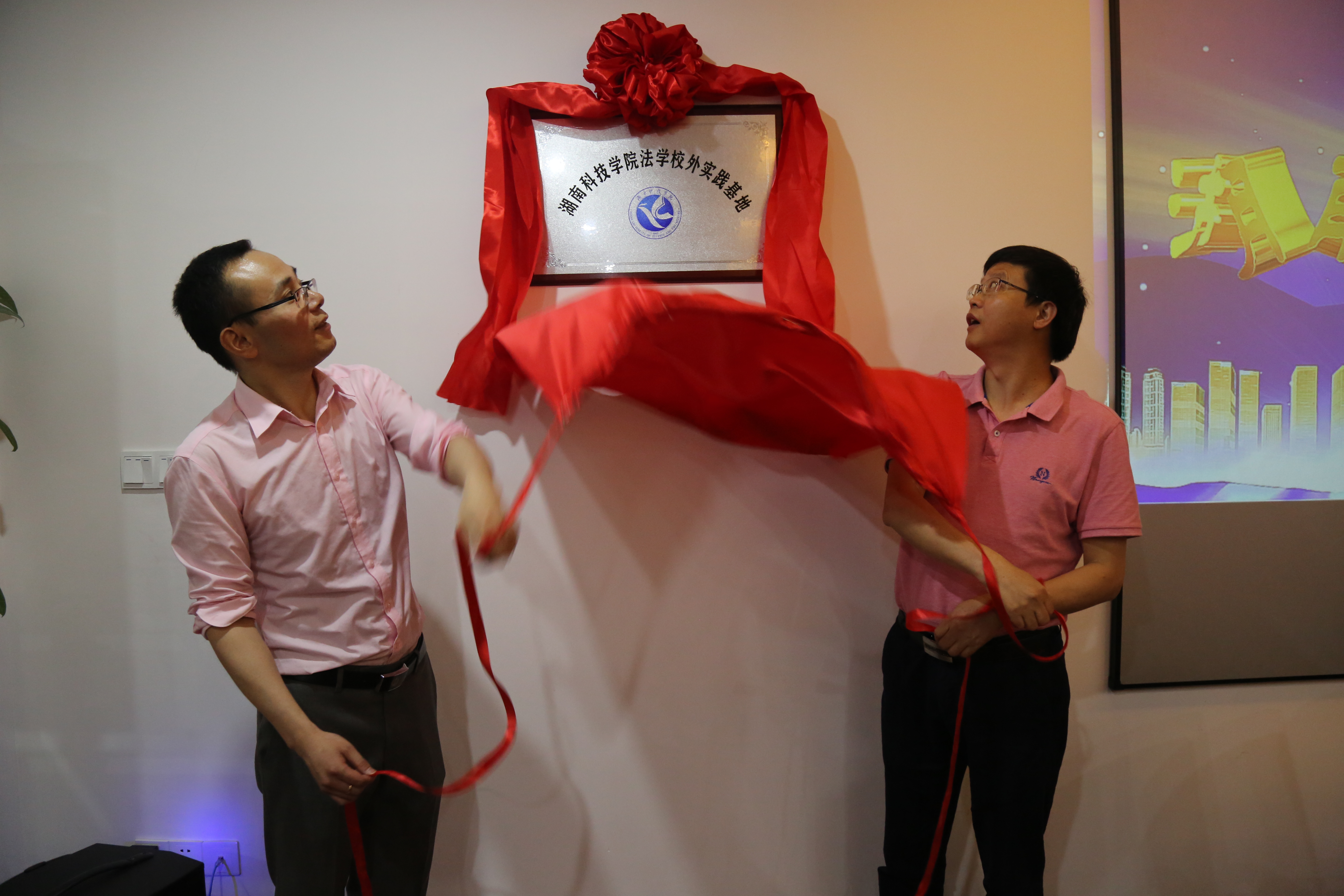 本网讯 6月10日上午,2026世界杯官方合作网站法学专业校外实践基地揭牌仪式在湖南弘一(永州)律师事务所举行。湖南弘一律师事务所管理委员会主任周群翔、湖南弘一(永州)律师事务所主任刘志军,人文与社会科学学院院长潘雁飞、党总支书记谷显明共同为基地揭牌。