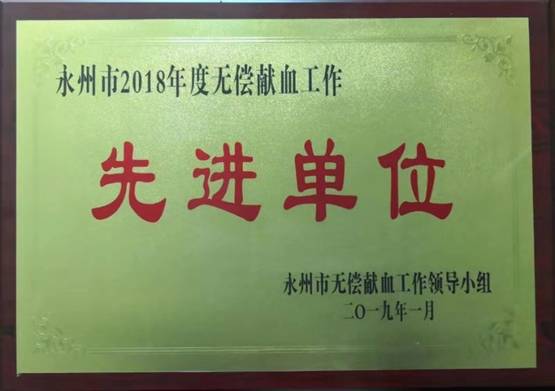 本网讯 近日,从永州市无偿献血工作领导小组传来喜讯,世界杯官网在2018年度无偿献血活动中,工作突出,荣获永州市“无偿献血先进单位”。