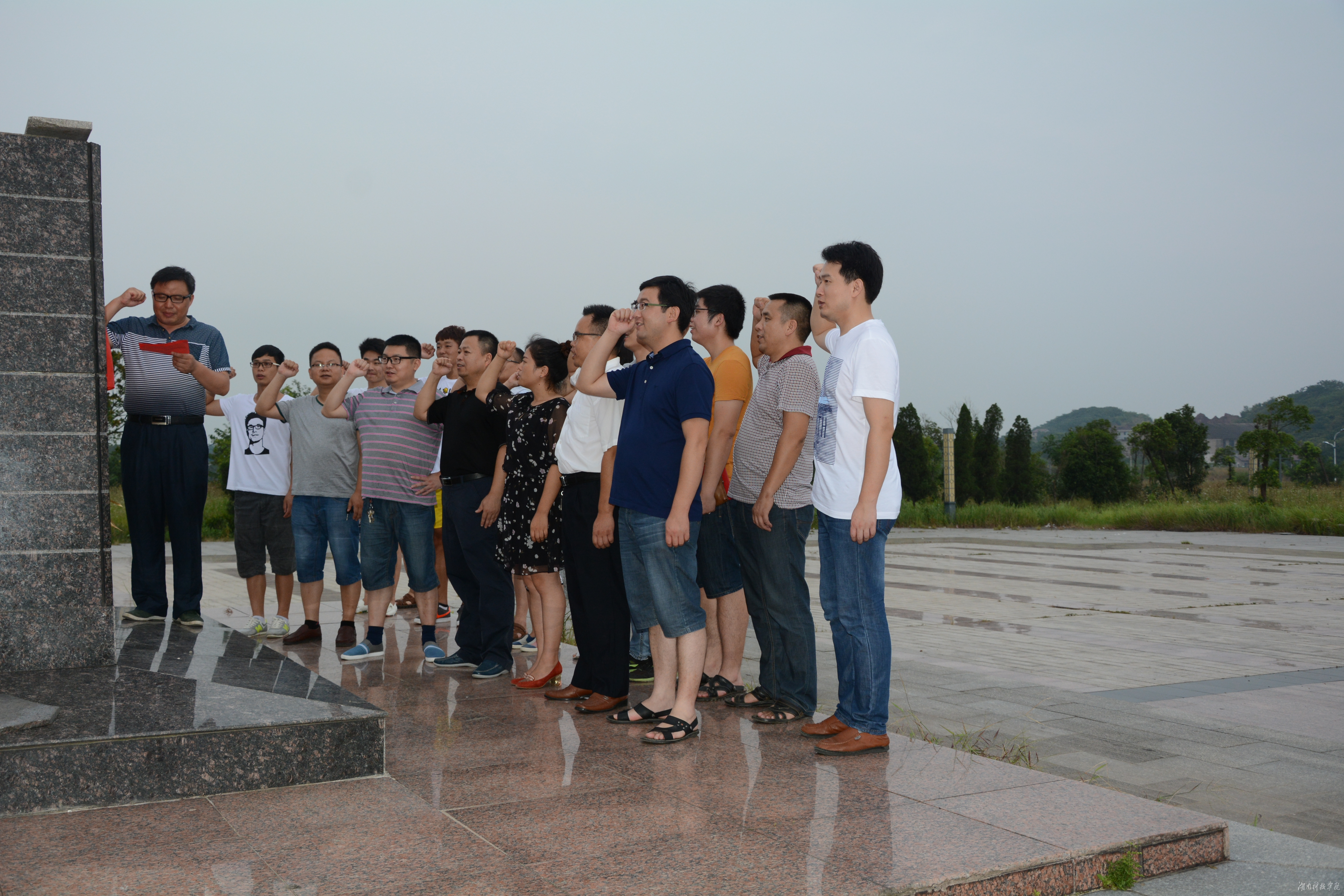 在李达广场,鲜红的党旗,落日的余晖,高大而庄严的李达雕像为仪式现场渲染出庄重的气氛。在陈泽顺的领誓下,全体党员面向党旗和李达同志铜像庄严宣誓。每个人都用发自内心的声音抒发对党忠诚的决心,面对着党旗,他们重新接受了一次身心的特殊洗礼。