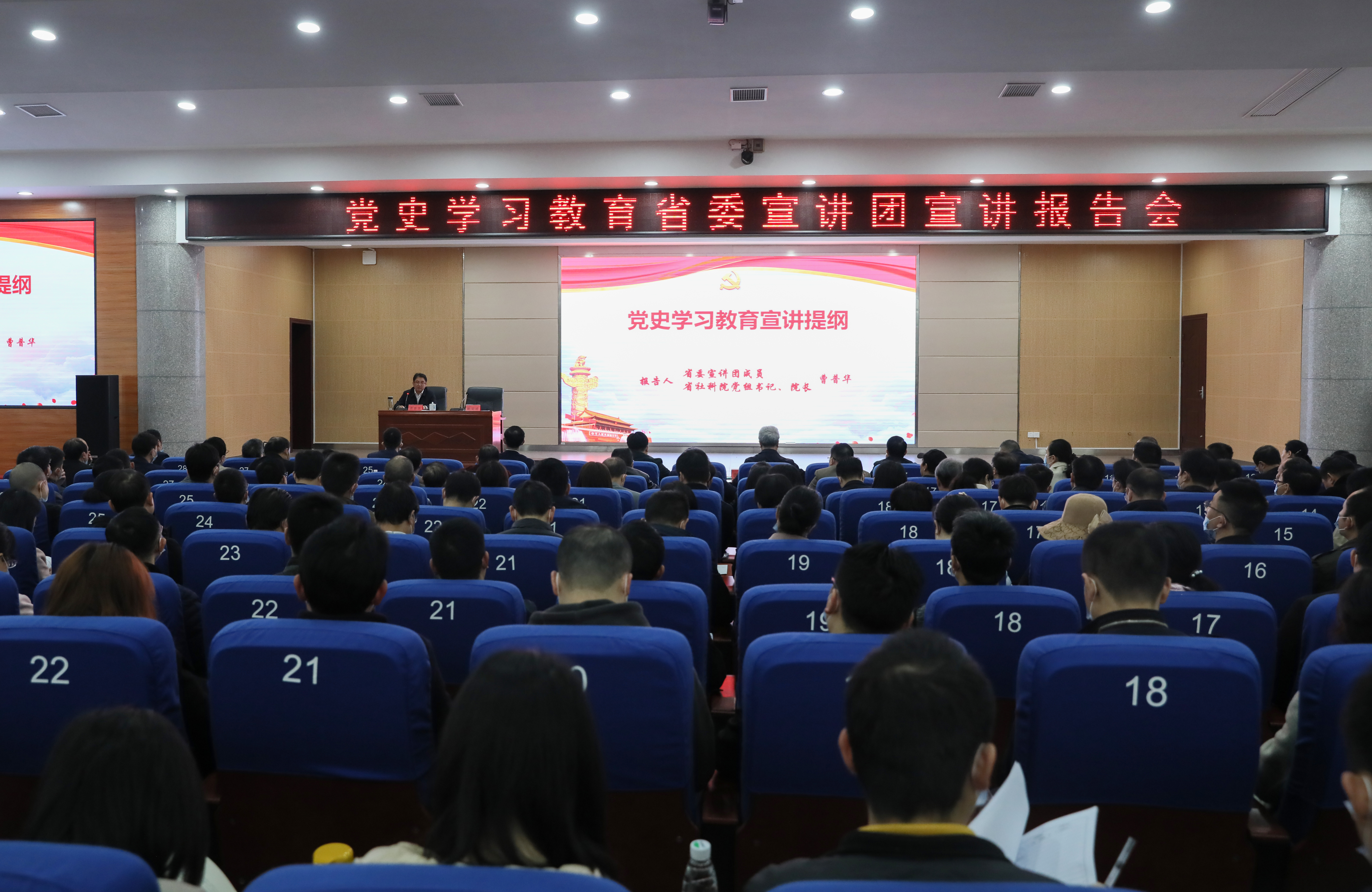 本网讯 4月9日上午,党史学习教育省委宣讲团宣讲报告会暨学校党委理论学习中心组2021年第四次集体(扩大)学习在潇湘大讲堂举行。省委宣讲团成员、省社科院党组书记、院长曹普华主讲,校党委书记曾宝成主持并讲话。党委班子成员,全体中层干部,全体党支部书记,师生党员代表聆听报告。