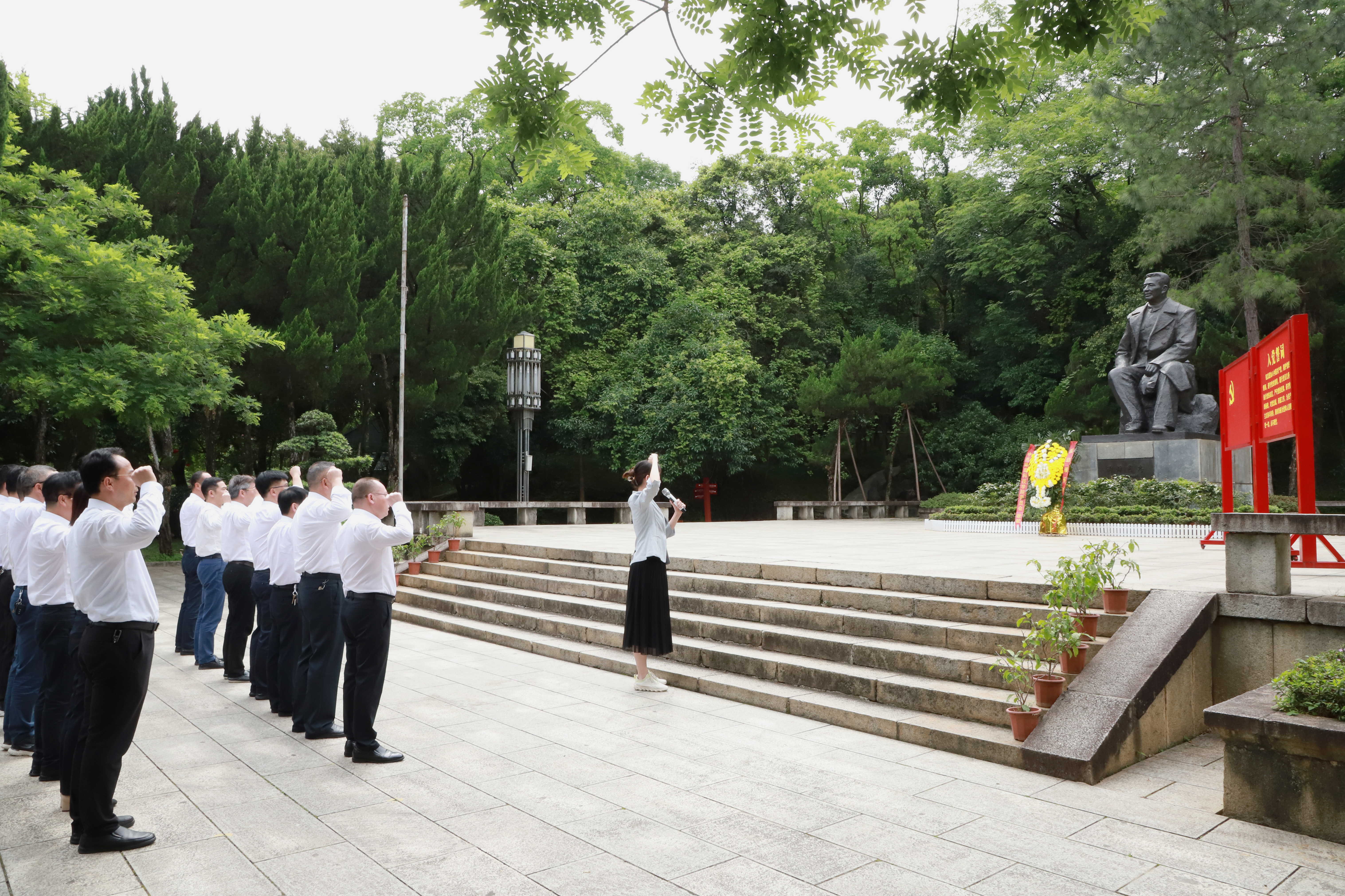 在陶铸同志铜像前,党员干部整齐列队,静默肃立,向革命前辈敬献花篮。党员干部重温了入党誓词,诵读了陶铸同志经典文章《松树的风格》,学习陶铸一心为民、一生为党的革命精神以及清廉自守的崇高风范。