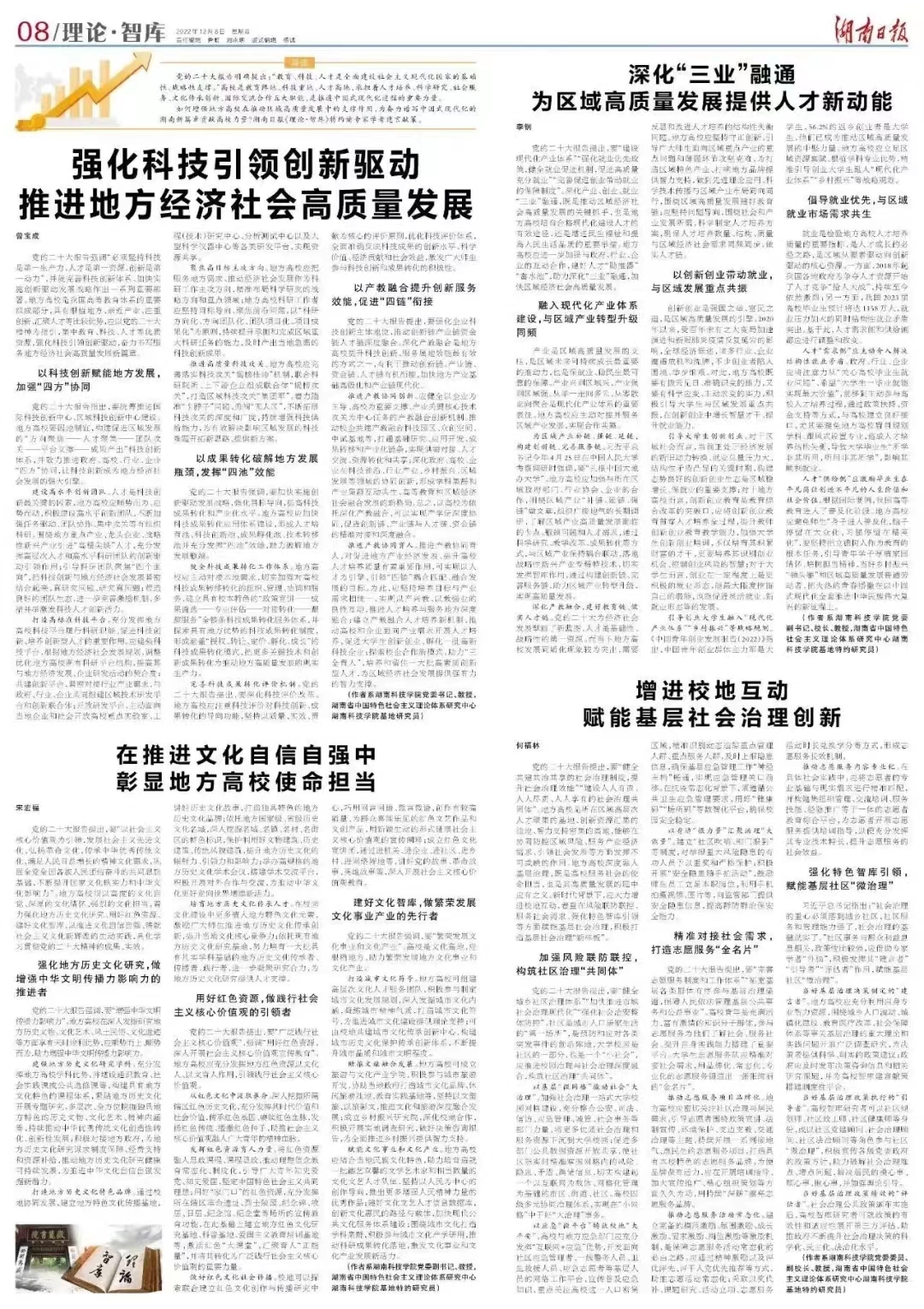 本网讯 党的二十大报告明确提出:“教育、科技、人才是全面建设社会主义现代化国家的基础性、战略性支撑。”围绕学习贯彻落实好党的二十大精神,12月8日,《湖南日报》第八版(理论·智库)整版刊发了世界杯官网四篇理论文章,文章聚焦地方高校在推动区域高质量发展中发挥支撑作用、为奋力谱写中国式现代化的湖南新篇章贡献高校力量谈思路举措,在主流媒体发出科院声音。