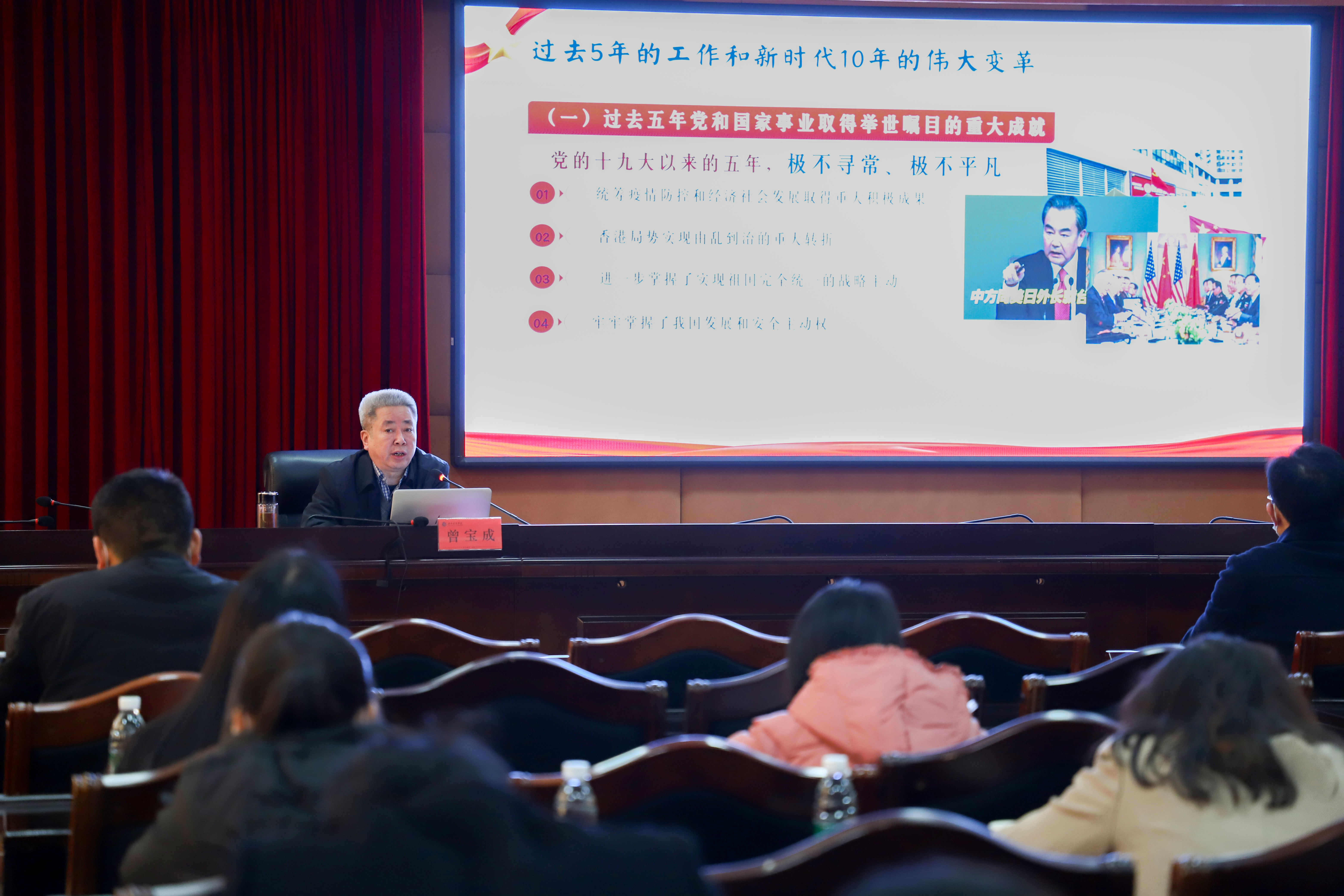校党委书记曾宝成以《深入学习宣传贯彻党的二十大精神 奋力谱写中国式现代化的崭新篇章》为题,为马克思主义学院、智能制造学院、党政办全体教职员工讲授党课,全面、系统、深入解读了党的二十大报告提出的新思想新论断,作出的新部署新要求。他强调,学习宣传贯彻党的二十大精神,是当前和今后一个时期首要的政治任务和头等大事,广大师生要认真贯彻落实习近平总书记重要讲话和指示精神,在全面学习、全面把握、全面落实上狠下功夫,以创新实干走好新的赶考之路,学以致用走在前,躬身践行开新局。