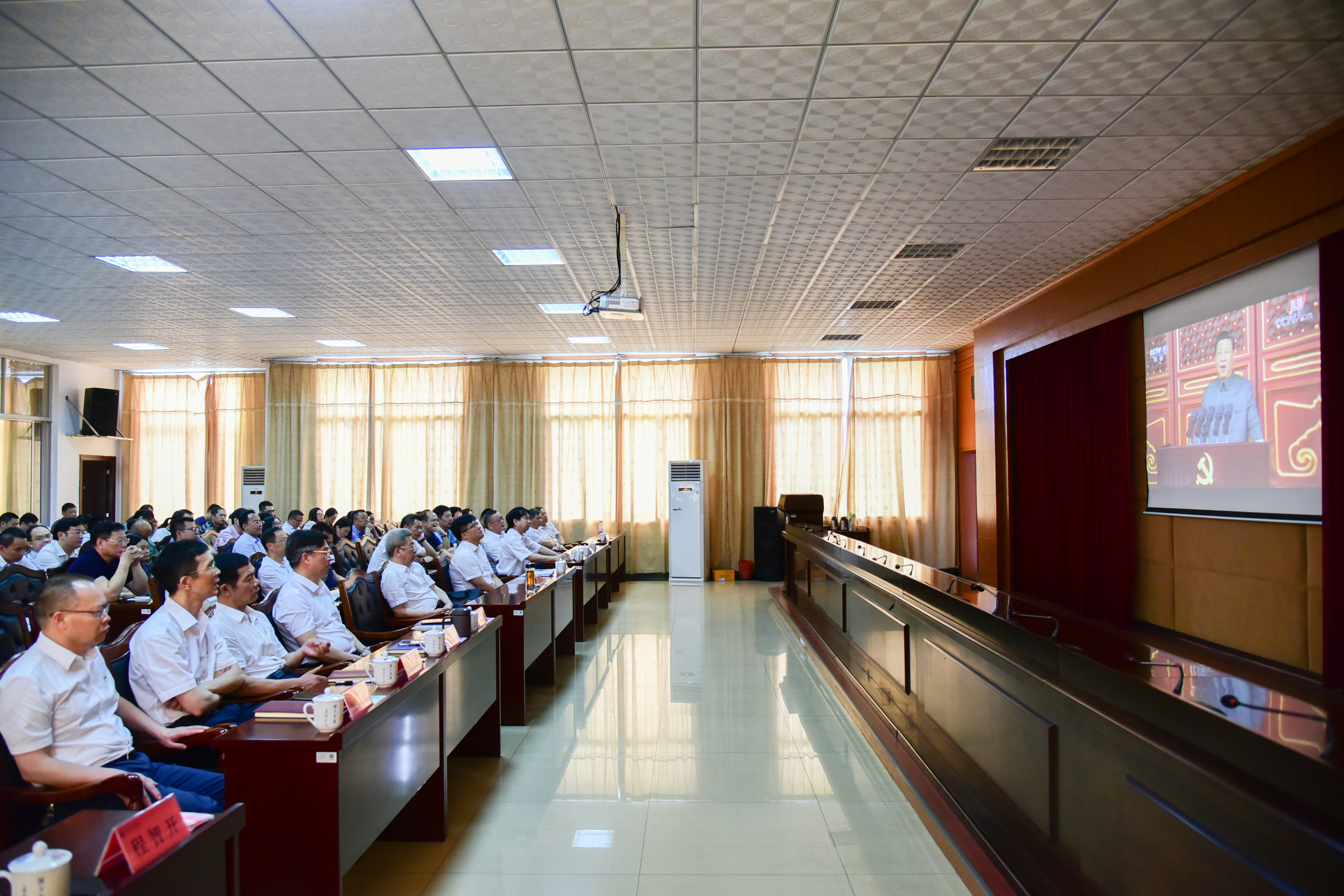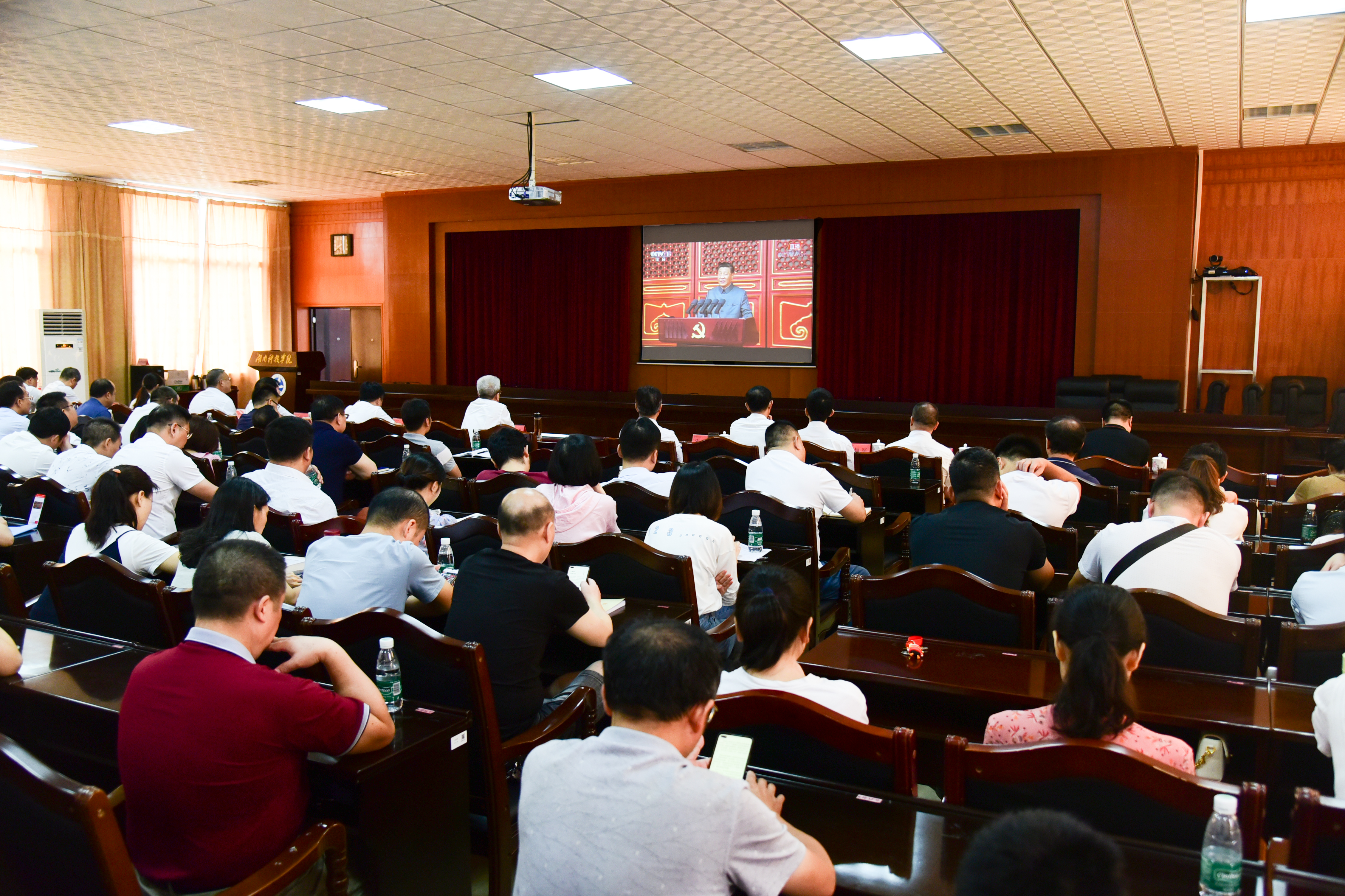 在行政办公楼八楼一会议室,全体校领导、机关党员干部认真聆听习近平总书记在庆祝大会上发表的重要讲话,整个会场庄重热烈,全体人员认真聆听,学习与记录大会内容。各教学学院分别在多媒体教室、学生宿舍等场所集中组织进行了收看。在学校乡村振兴联点帮扶村——江永县桃川镇邑口村,驻村工作队组织该村党员、干部和部分村民代表集中进行了收看。