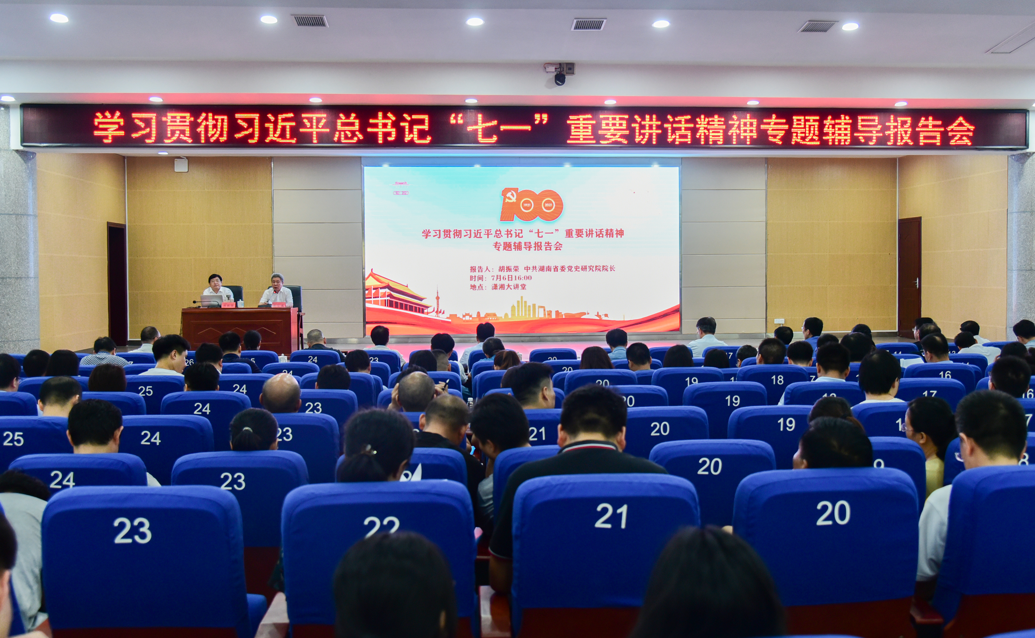 本网讯 7月6日下午,学校举行学习贯彻习近平总书记“七一”重要讲话精神专题辅导报告会。中共湖南省委党史研究院院长胡振荣应邀来校作专题辅导。省委党史研究院综合部主任、一级调研员刘文典,市委党史研究室主任李祥红,新田县委副书记易先平,在家校领导及师生党员代表600余人聆听专题辅导报告。校党委书记曾宝成主持报告会。