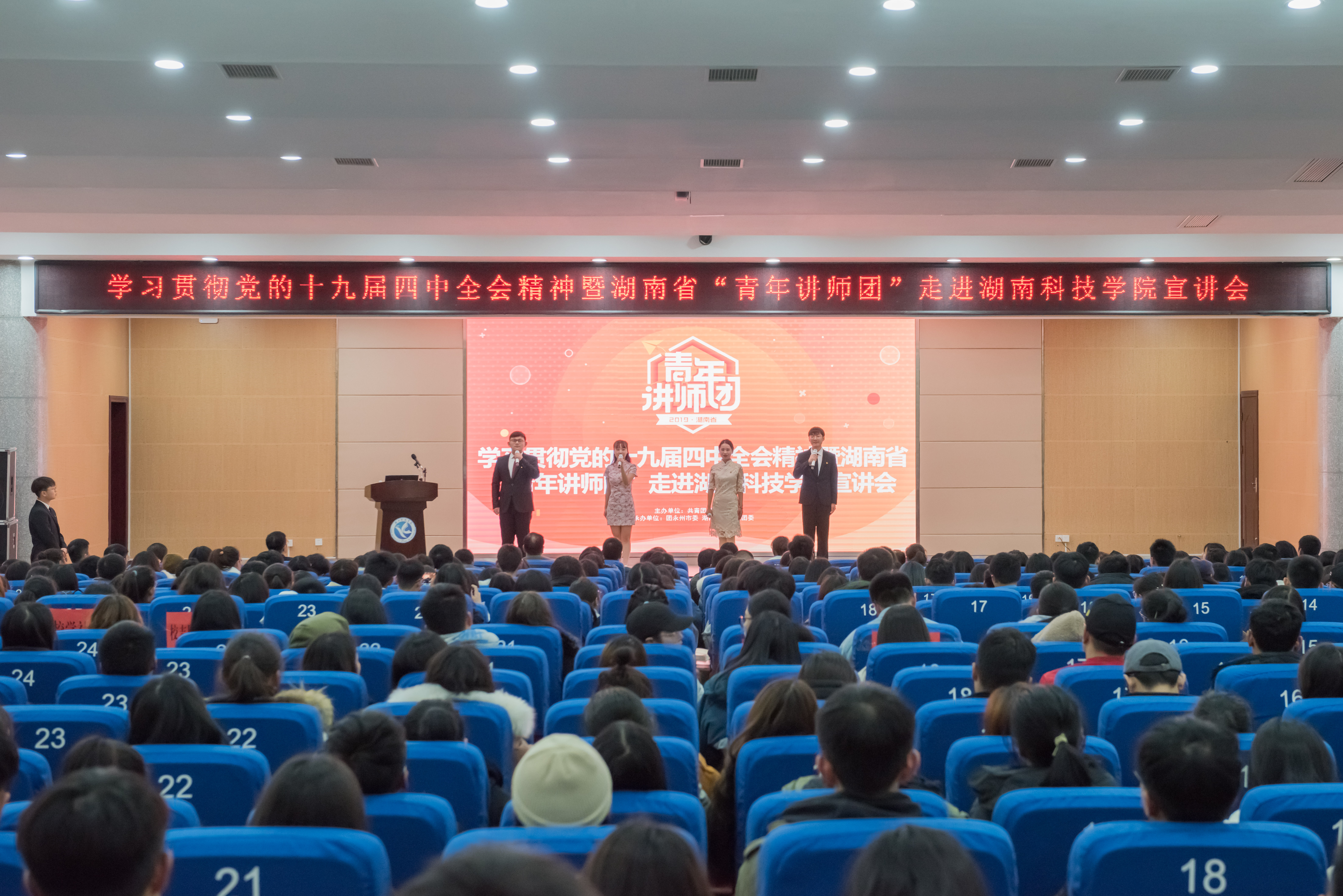 本网讯 12月19日晚,湖南省“青年讲师团”走进世界杯官网宣讲十九届四中全会精神。青年讲师们围绕学习贯彻党的十九届四中全会精神,结合自身工作实际,以自己的亲身经历和真情实感,生动讲述祖国发展成就故事和青年追梦奋斗故事,学校800余名师生代表现场聆听。