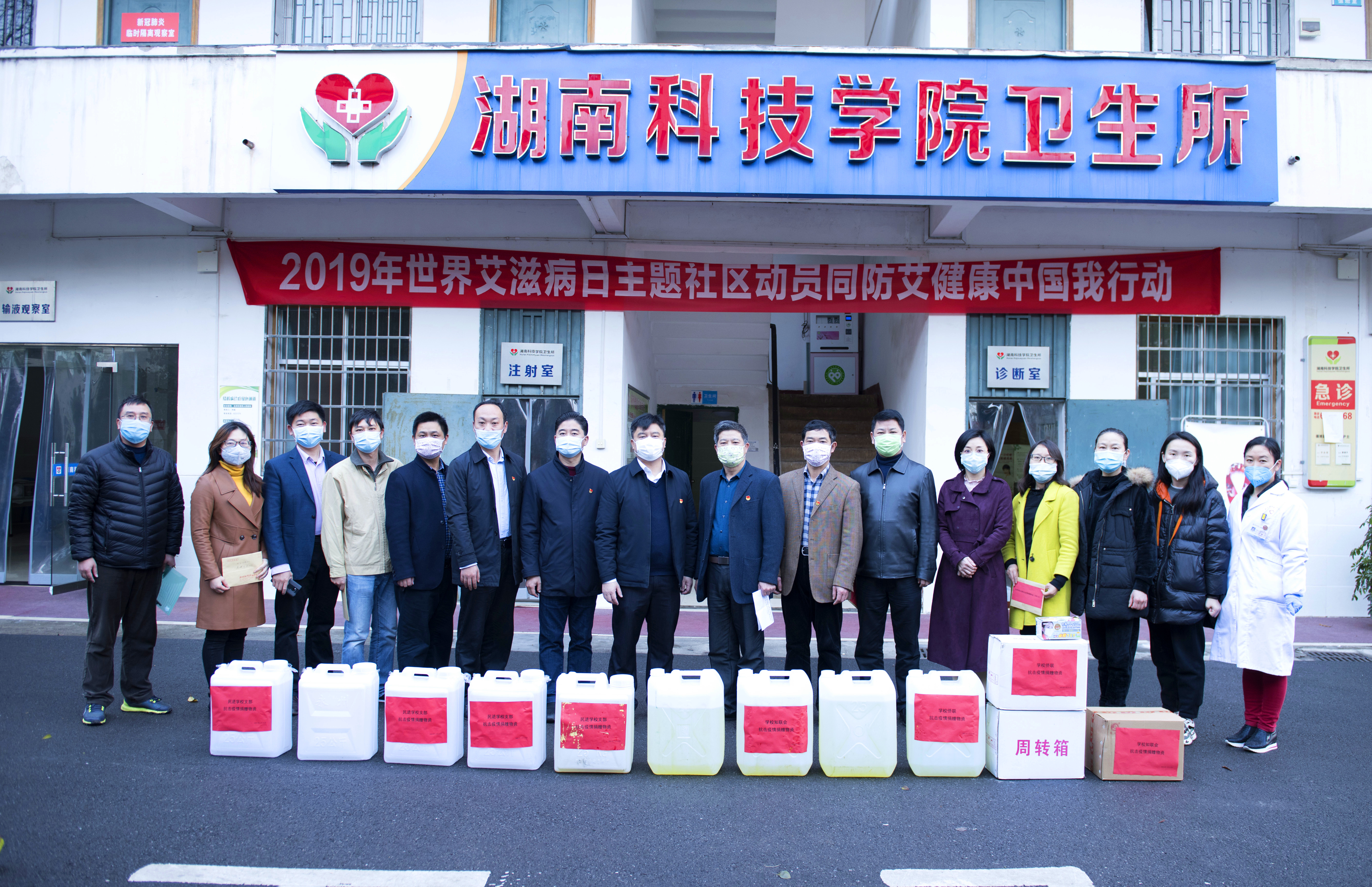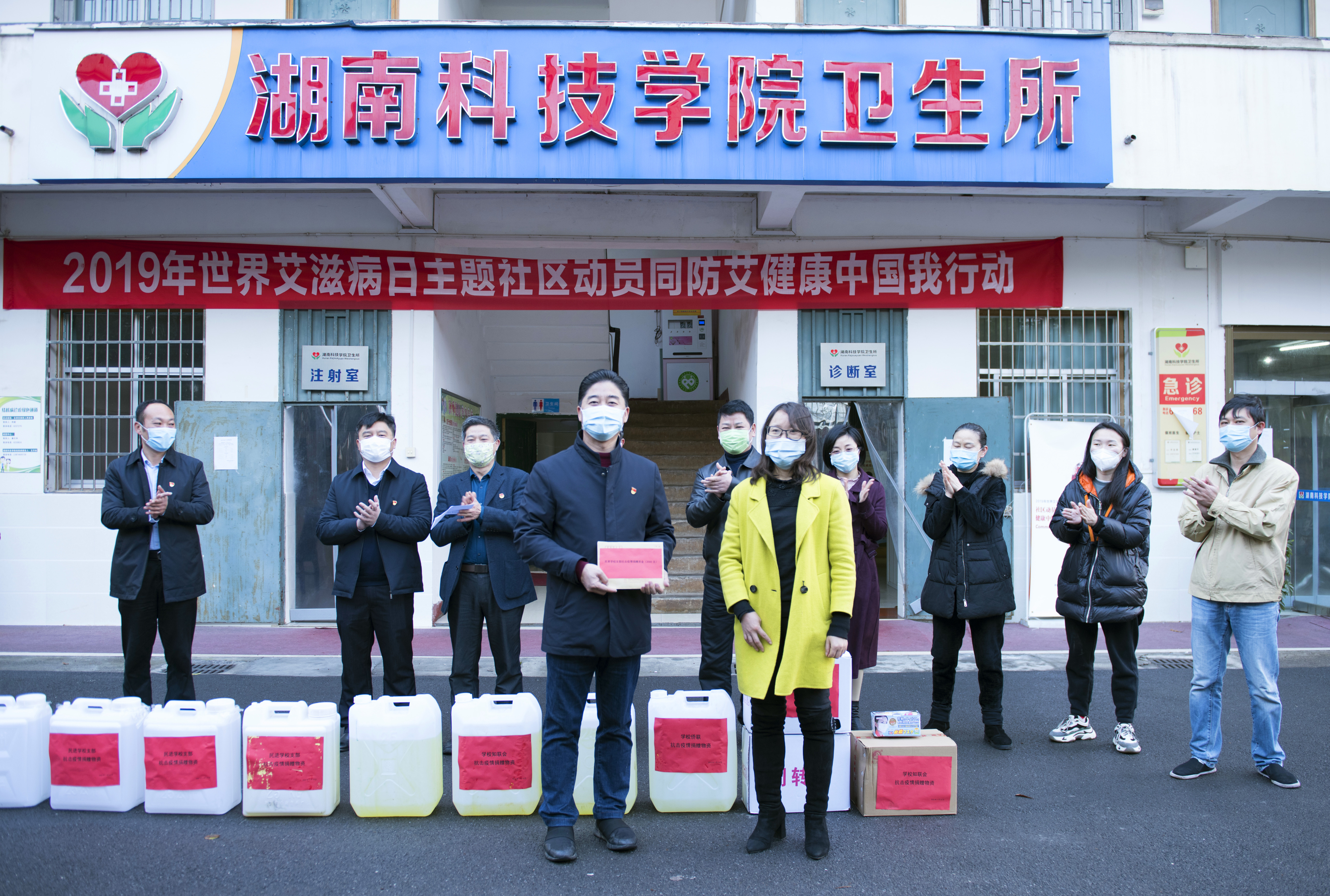 本次捐赠共有医用酒精425斤、84消毒液160斤、口罩50个以及4500元现金。彭立威和吴小林代表学校分别接受了捐赠的现金和物资。