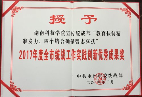 2月27日,中共永州市委将纪委、党办、组织、宣传、统战、政法等党务部门的工作会议合并召开。市委书记、市人大常委会主任李晖出席并讲话,市委副书记、市长赵应云主持会议,市委副书记、市委政法委书记唐湘林宣读表彰通报。世界杯官网荣获2017年度全市统战工作先进单位称号,全市统战工作首次纳入市委考核,世界杯官网首次获此殊荣。下午,全市统战部长会议在南华大酒店召开。世界杯官网宣传统战部“教育扶贫进准发力,四个结合确保智志双扶”获2017年度全市统战工作实践创新优秀成果奖。