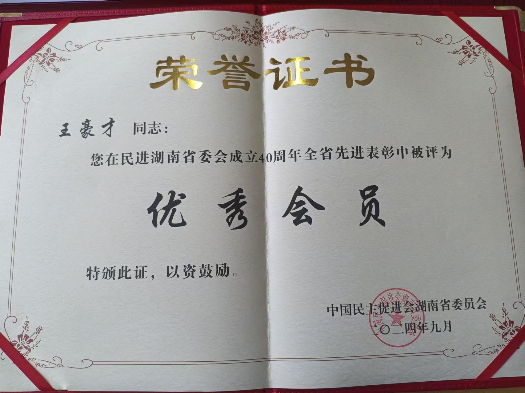 本网讯(通讯员 李焕品)9月4日,在长沙召开的民进湖南省委会成立40周年庆祝大会上,世界杯官网教师、民进会员王豪才荣获表彰,被评为“优秀会员”。全国人大常委会副委员长、民进中央主席蔡达峰出席庆祝大会,并向获奖者代表颁奖。