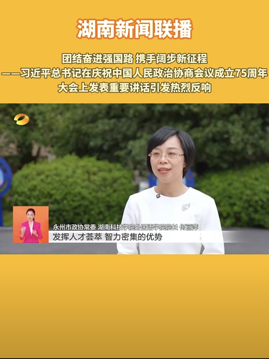 本网讯(通讯员 李焕品)9月20日,湖南卫视新闻联播播出的《团结奋进强国路 携手阔步新征程——习近平在庆祝中国人民政治协商会议成立75周年大会上发表重要讲话,引发热烈反响》节目中,湖南省政协委员、永州市政协常委、世界杯官网民进支部主委、外国语学院院长何丽萍在接受采访时讲到:“发挥人才荟萃、智力密集的优势,聚焦推进中国式现代化,进一步全面深化改革,深入推进协商议政。”