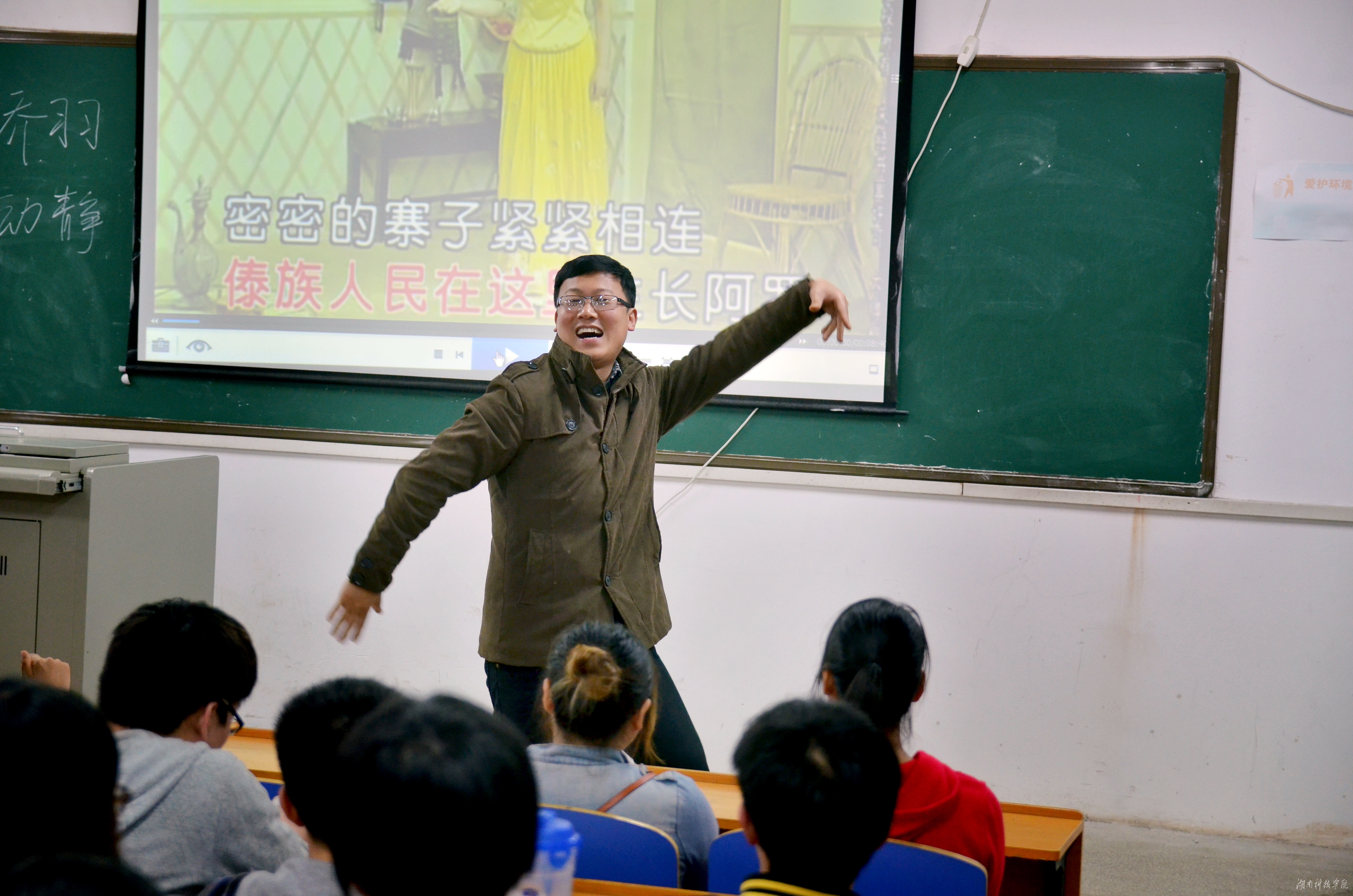 他摘下眼镜,伸个懒腰,一副刚从被窝里爬出来的样子,揉一揉惺忪的睡眼,用孩子般干净的眼神探望着欣欣然的春色,空气中溢满了他的心旷神怡。其实,这是李超老师上形体与表演课的情形,为了使同学们朗诵好《春》里面“一切都像刚睡醒的样子,欣欣然张开了眼”这一句话,他用情景再现的方式把作者写作的心理表演出来。他把文章的每一句话都分析透彻,引导学生感受情绪,体会“我就在”的境界。