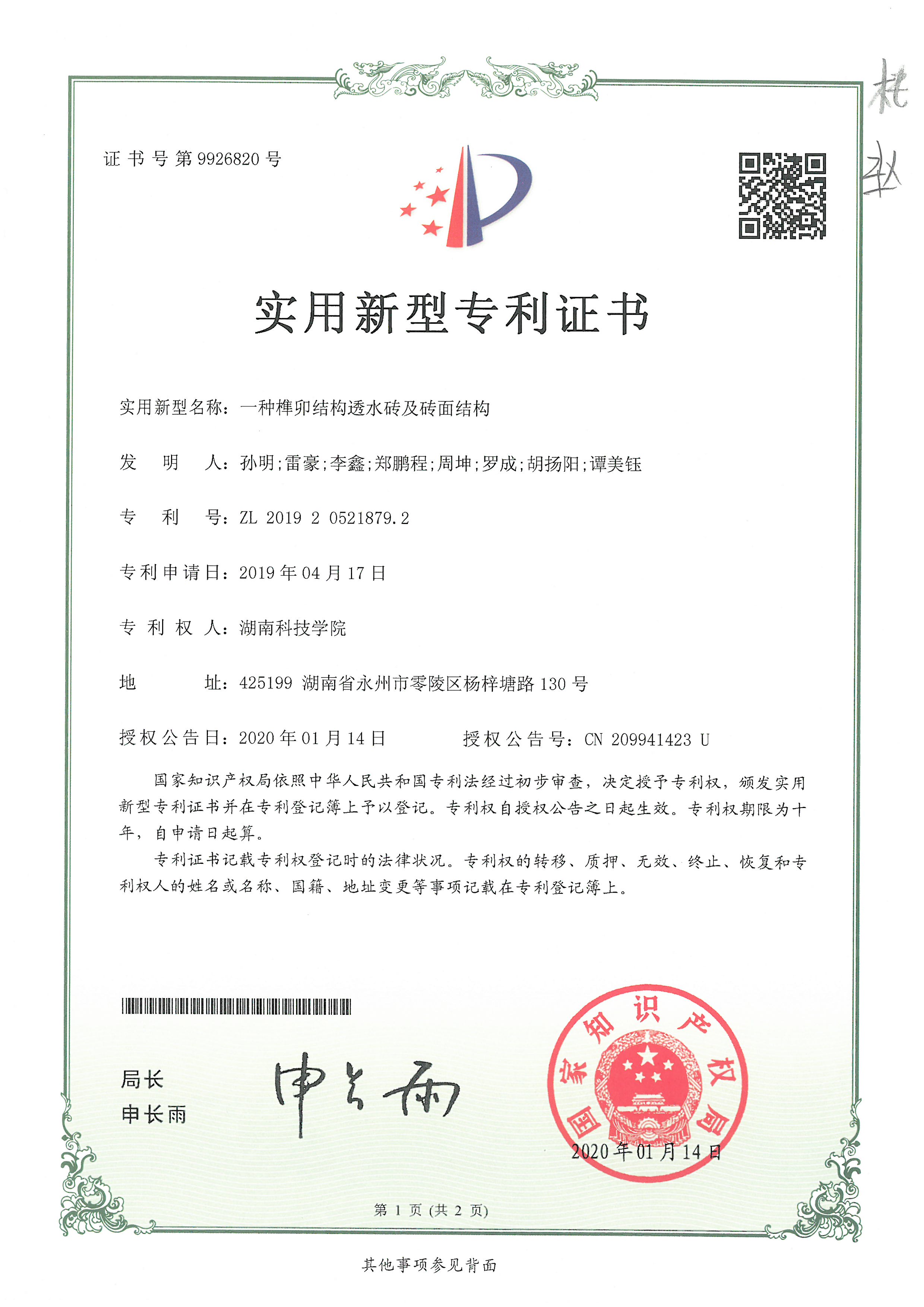 孙明ZL201920521879.2榫卯结构透水砖实用新型背面