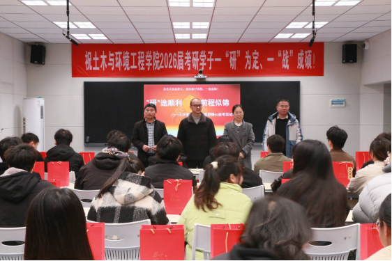 本网讯(通讯员 廖贤毅 彭语彤 )“加油!”“上岸!”“前程似锦”……在阵阵鼓励、祝福声中,12月17日,土木与环境工程学院一年一度的2026届“‘研’途顺利 前程似锦”考研暖心送考活动在逸夫楼403教室如约举行。学院全体领导,辅导员、班主任、任课老师和考研学子们参加。
