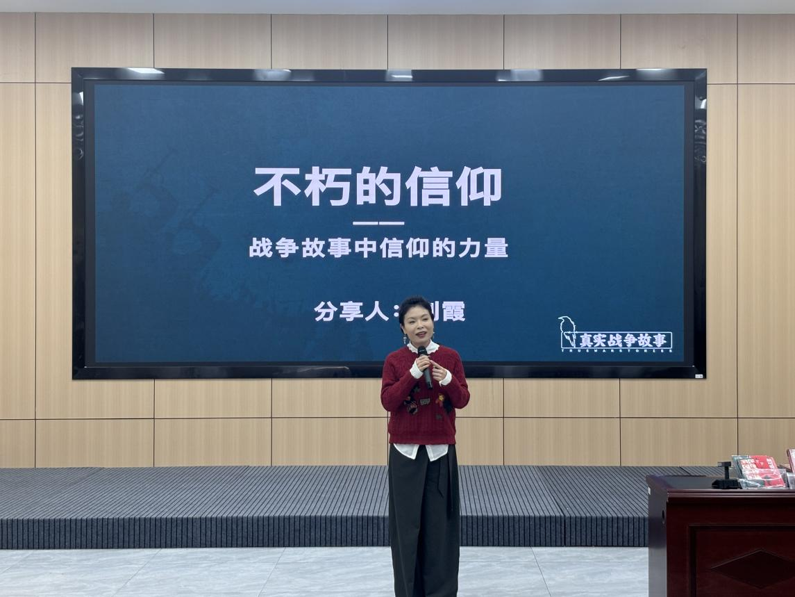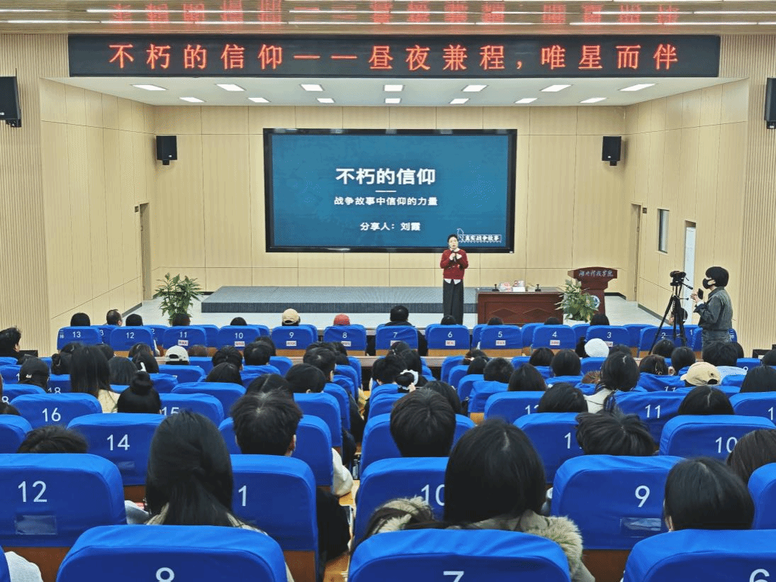 2025年11月25日下午,我院汉语言文学与新闻传播系2003级毕业生、北京国光霞印文化传媒CEO、“真实战争故事”平台创始人刘霞,应邀重返母校,在明德楼100报告厅为文法学院的学弟学妹们带来一场题为《不朽的信仰——昼夜兼程,唯星而伴》的红色教育报告会。本次活动旨在通过她十六年来记录整理的珍贵口述历史,引导广大学子深刻感悟信仰的力量,赓续红色血脉。