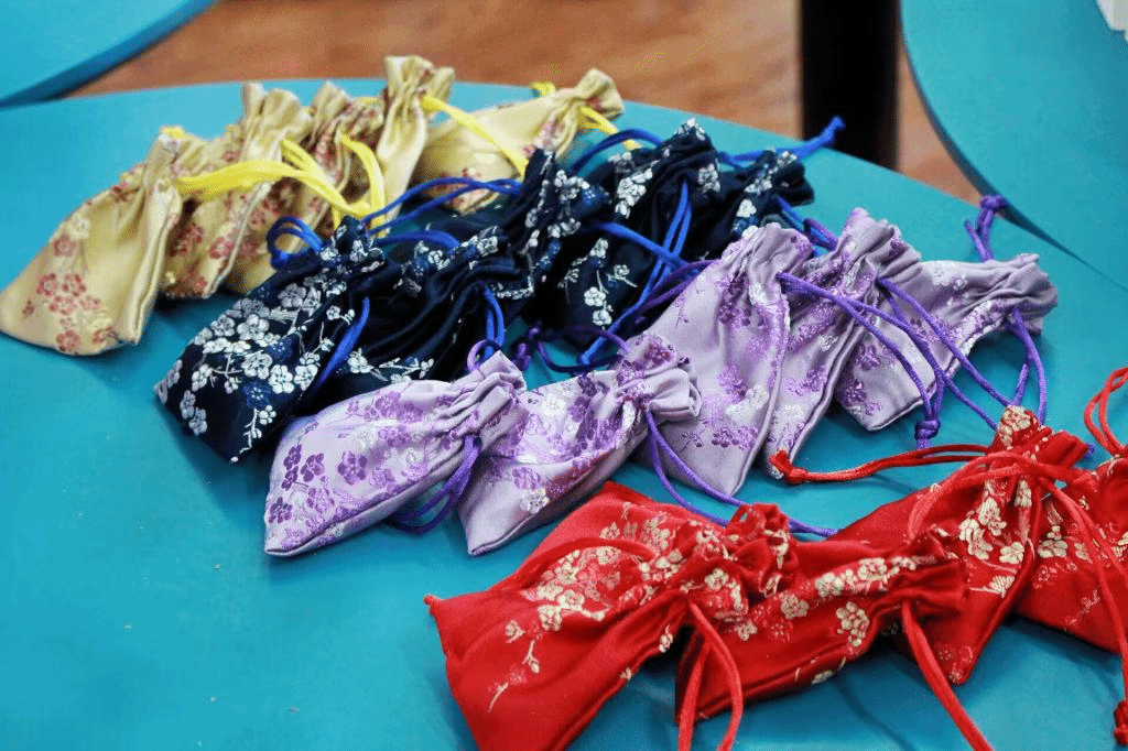 活动一开始,志愿者们就迫不及待地挤到桌子面前,为老人们准备礼物。抽绳、装袋、拉紧、打包……动作行云流水,一个个精致小巧香囊便制作完成了,弥漫着桂花的香甜和吴茱萸的辛烈。同时,寓含祝愿身体健康的重阳糕在一并放在礼袋中,山药为泥,和糯米做粉团,色如白玉;枣泥为馅,加白糖制糖馅,甜香浓郁。活动中,志愿者们相互交换成品,一起交流制作经验,欢声笑语连连不断。