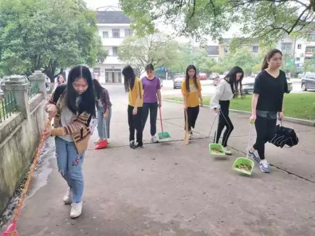 活动中期对活动范围进行分区,将工作范围具体分配到每一小组。各小组成员带着扫帚、刷子、抹布、撮箕、水桶等劳动工具清扫楼梯,草地,清理宣传栏。打扫完毕后,大家把垃圾统一丢进指定垃圾桶,卫生工具统一归还。