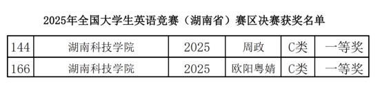 (通讯员:李雯)5月11日上午9:00至11:00,2025年全国大学生英语竞赛(NECCS)湖南省决赛在湖南工商大学乐知楼顺利举行,世界杯官网学生周政、欧阳粤婧两位同学参加C类竞赛,均获一等奖。