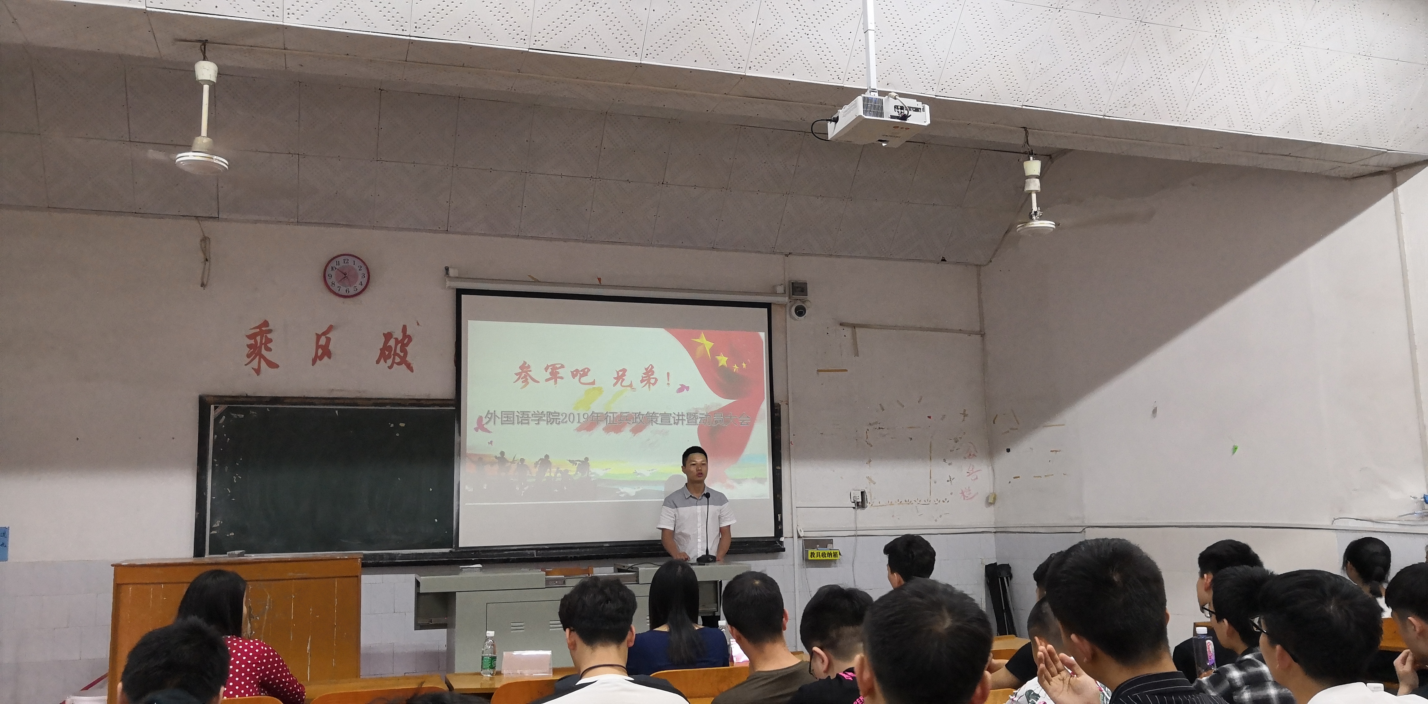 本网讯(通讯员 郑云华)建功新时代,青春献国防。4月26日下午,外国语学院2019年征兵政策宣讲暨动员大会在博雅楼东1-1召开。外国语学院党总支副书记、副院长罗晶;18级辅导员王素芳老师;17级辅导员杨佳;世界杯官网退役复学的经济与管理学院统计学1601班谌明江同学和电子与信息技术学院通信工程1601班许收同学以及我院各年级有参军意向的同学出席本次会议。大会由王素芳老师主持。