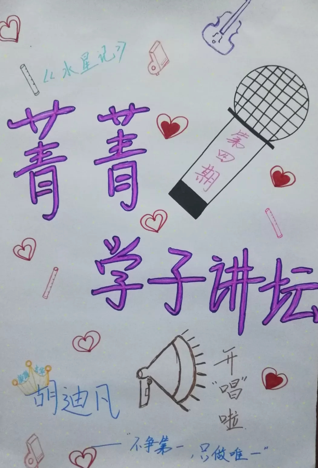 最后,菁菁学子讲坛第四期——“不争第一,只做唯一”在胡迪凡的优美歌声中落下帷幕。愿我们都能青春无悔,成为自己的唯一!