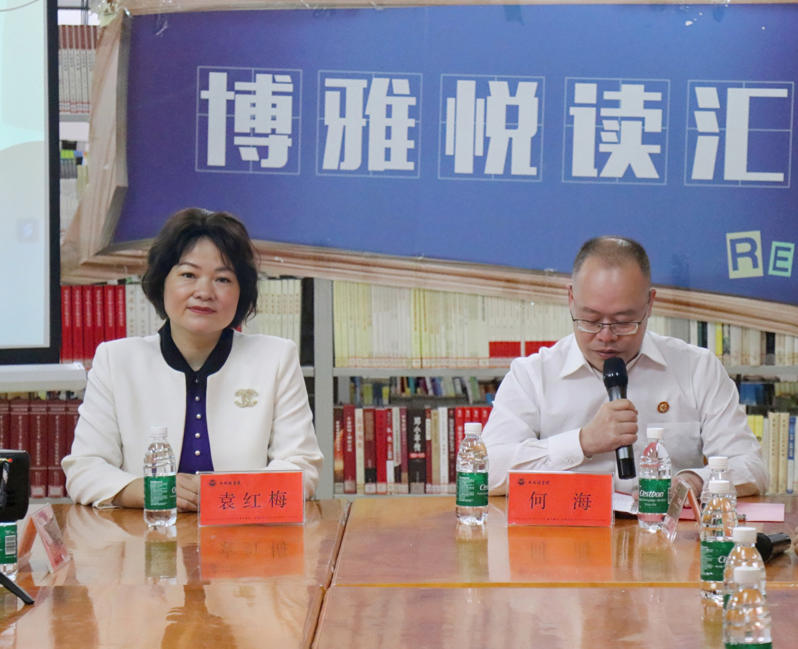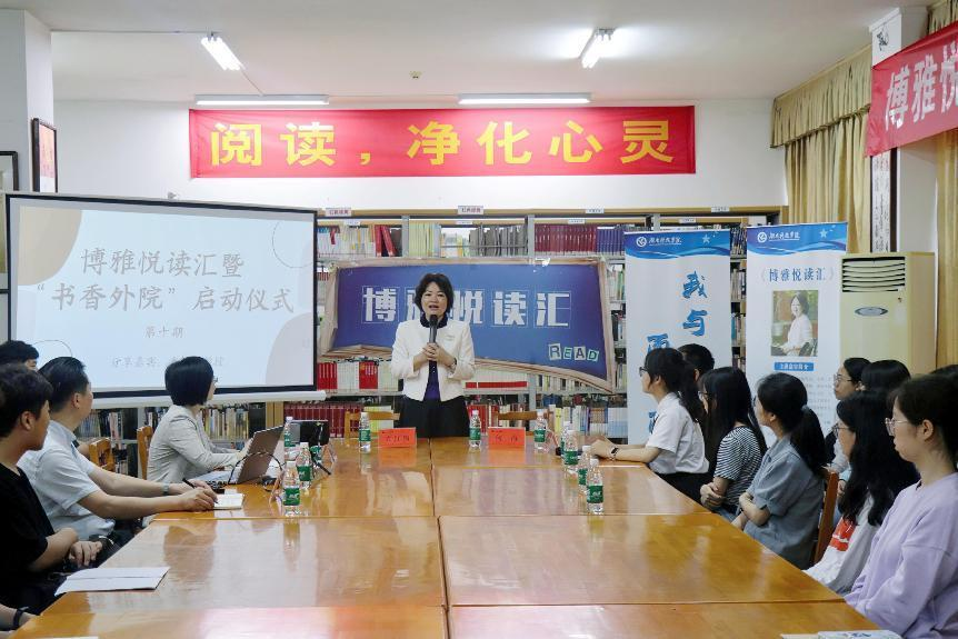 (通讯员 旷湘怡 摄影 金雪荣)5月6日上午8:30,外国语学院于图书馆104综合阅览室开展了第十期博雅阅读汇暨“书香外院”启动仪式。党委委员、副校长何海,图书馆馆长郑际根,外国语学院院长何丽萍,外国语学院党总支书记唐君应邀出席。本期邀请到的嘉宾是英语专业1995届校友、党的二十大代表、教授、博士、注册心理师,现任中南林业科技大学心理健康教育研究中心主任袁红梅。全院共有40名同学参加此次活动。