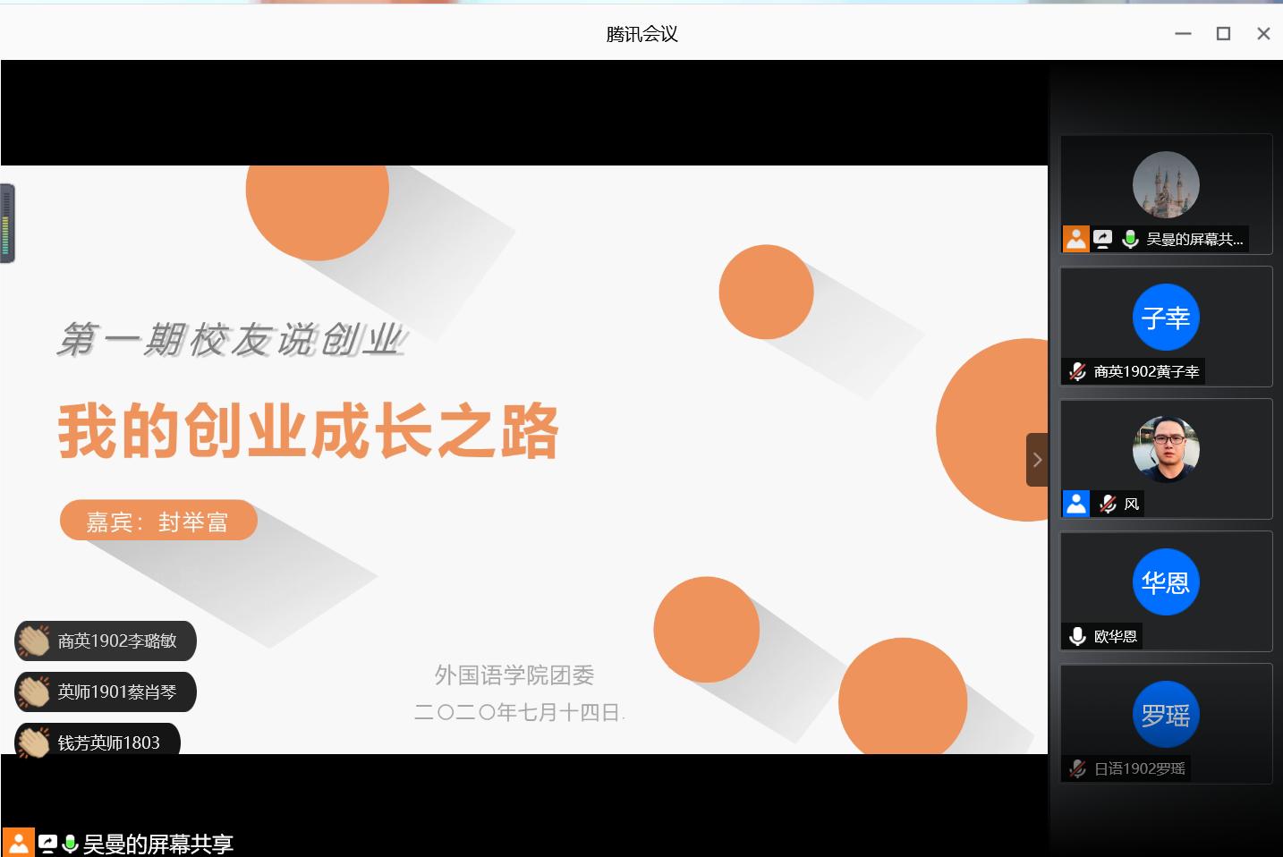 封举富先生从自身的创业成长之路出发,通过分析如何选择行业创业、怎样使企业稳步前行以及如何于激烈的竞争中突出自身优势等问题告诫大家一定要注重不断学习才能不断取得进步。封举富先生还围绕创业方向、家庭与工作的平衡、特定行业的就业前景等方面,提出了自己的看法及建议,并希望大家多去实践,锻炼吃苦耐劳的精神为未来就业打下坚实的基础。分享会最后,封举富先生还为学弟学妹们在线解答了关于择业与创业的相关疑问,现场气氛非常热烈。