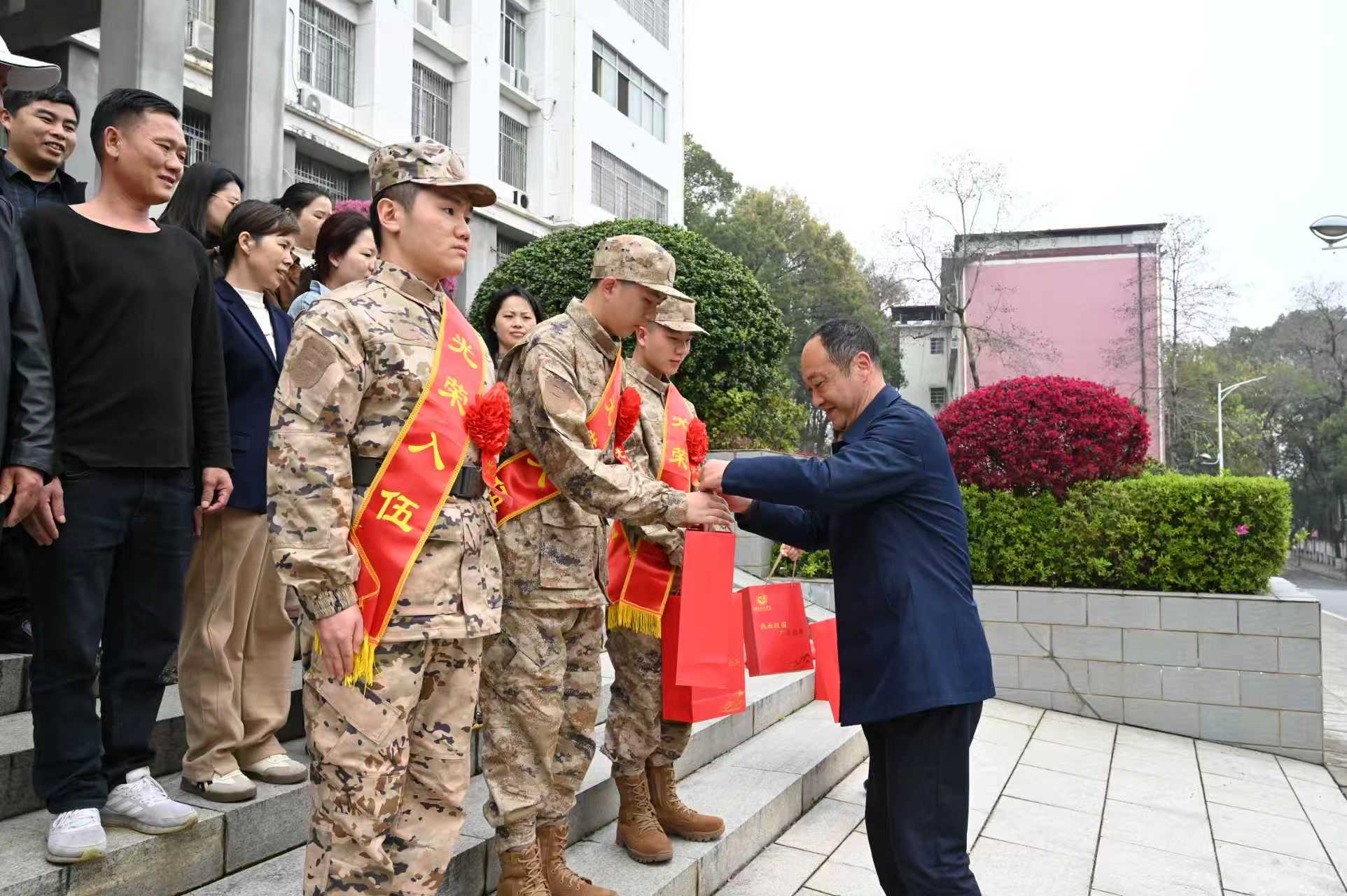 杨涛代表学校向光荣入伍的全体新兵表示热烈祝贺,为入伍新兵披绶带、戴红花、赠送入伍纪念品,将母校的关怀与希望送到每一位新兵手中,同时向情系国防、送子参军的家长们致以崇高敬意,向奋战在征兵工作一线的师生员工表示衷心感谢。他还对入伍新兵提出三点期望:一要筑牢忠诚军魂,坚定不移听党话、跟党走,快速完成从校园学子到革命军人的角色转变,争做“有灵魂、有本事、有血性、有品德”的新时代军人;二要锤炼过硬本领,严守部队纪律、刻苦军事训练,发扬科院人吃苦耐劳、奋勇争先的优良作风,在军营大熔炉里淬炼成钢;三要勇担时代使命,把个人青春理想融入强军梦、中国梦,以实际行动为国防和军队现代化建设贡献力量,为家乡争光、为母校添彩。