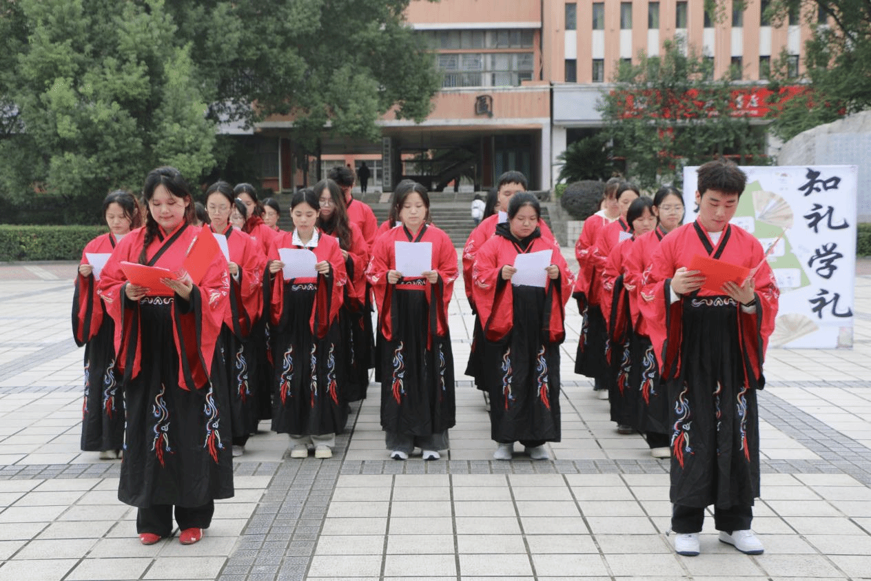 “不学礼,无以立”、“人无礼则不生,事无礼则不成......”在经典诵读区,学生们齐声朗诵《礼记》《论语》等典籍中关于礼仪的经典篇章,构筑起一道独特的校园人文风景。