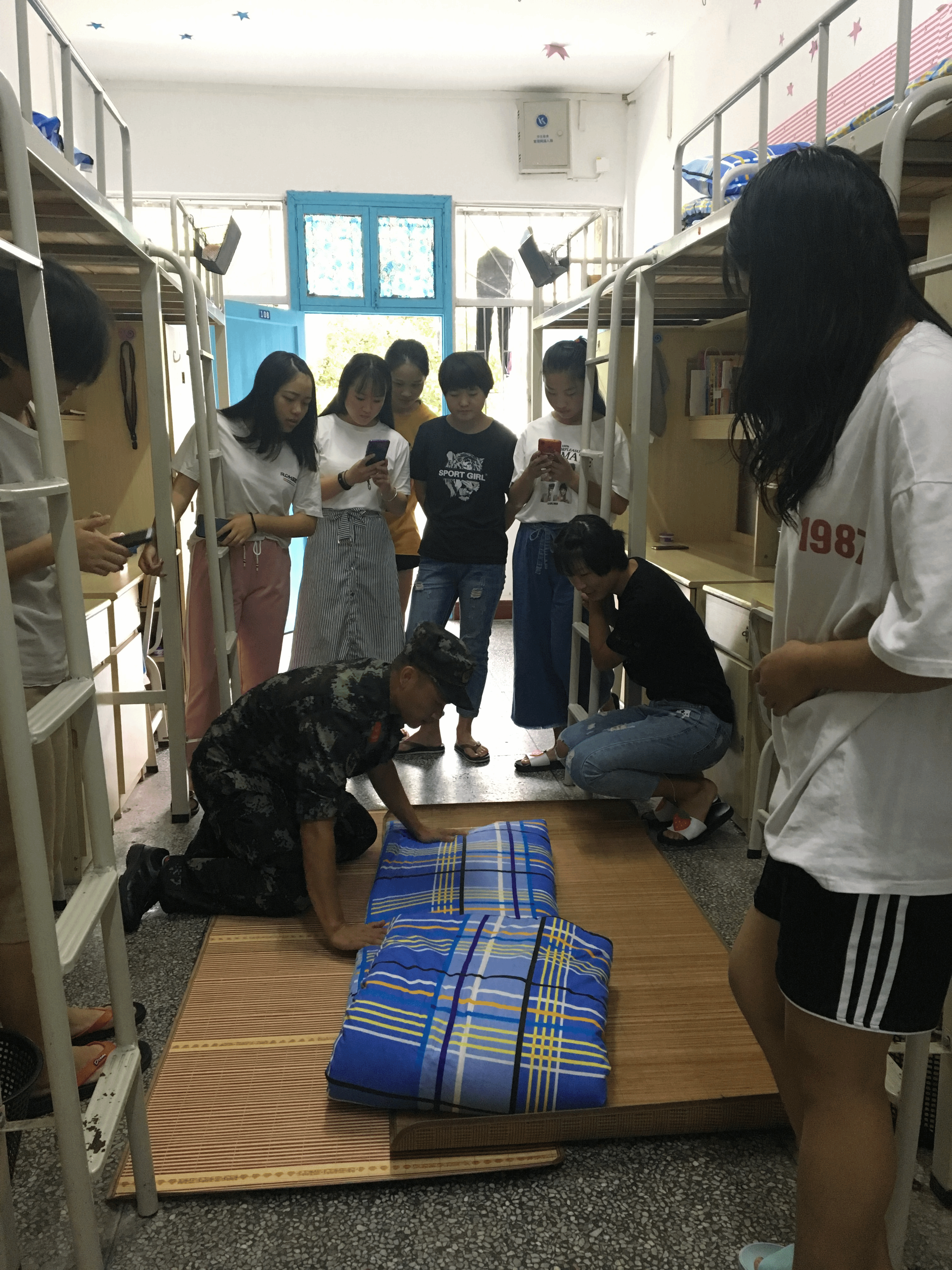 教官们严格按照部队标准,对宿舍物品摆放、被褥叠放、地面清扫等内务方面提出了要求并指出了在整理细节方面的注意事项。随后教官为同学们演示叠被子,被子在教官“叠、压、捋”几个动作之下,变成了四四方方的“豆腐块”,同学们一一跟着学习,寝室里一个个“豆腐块”映入眼帘。