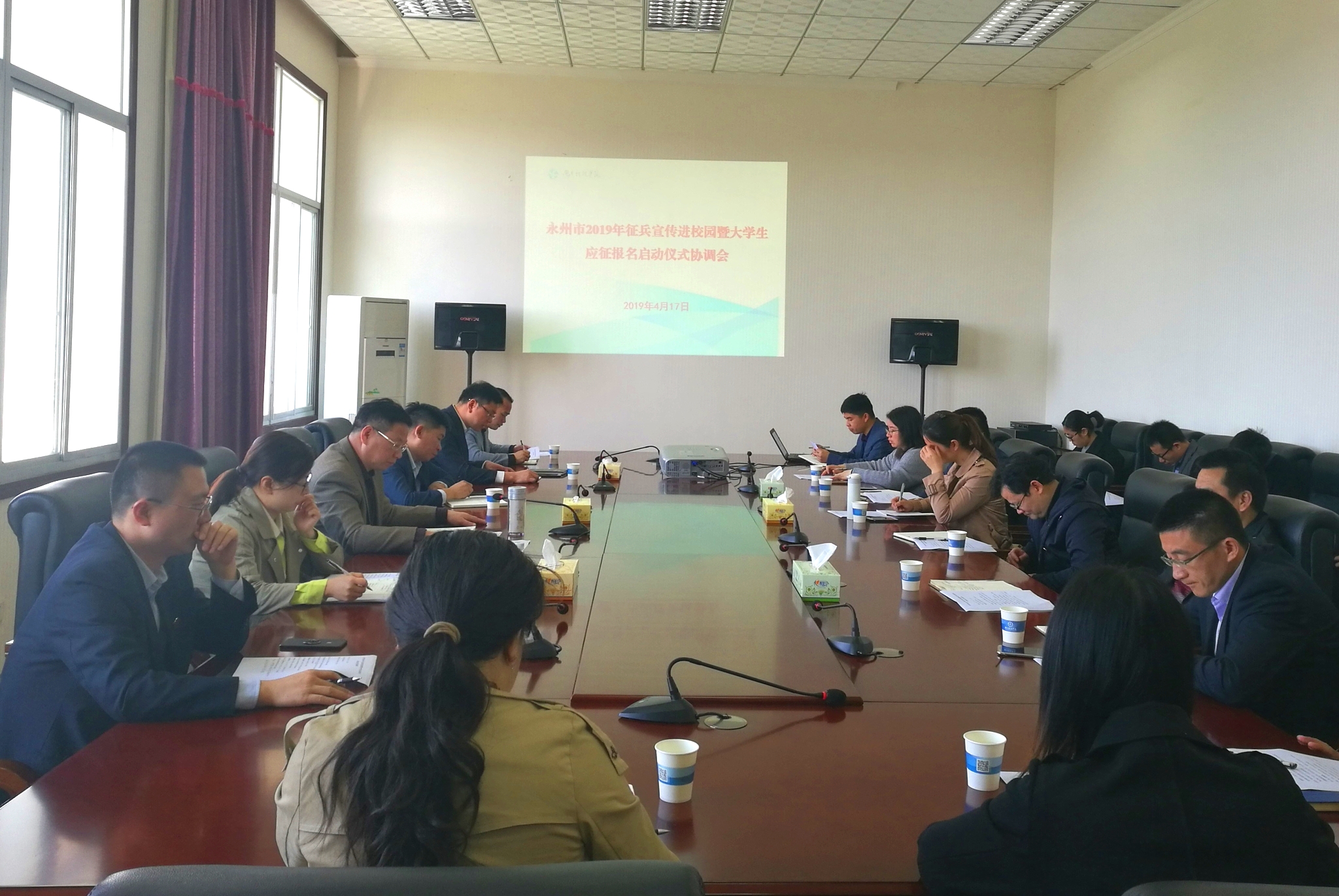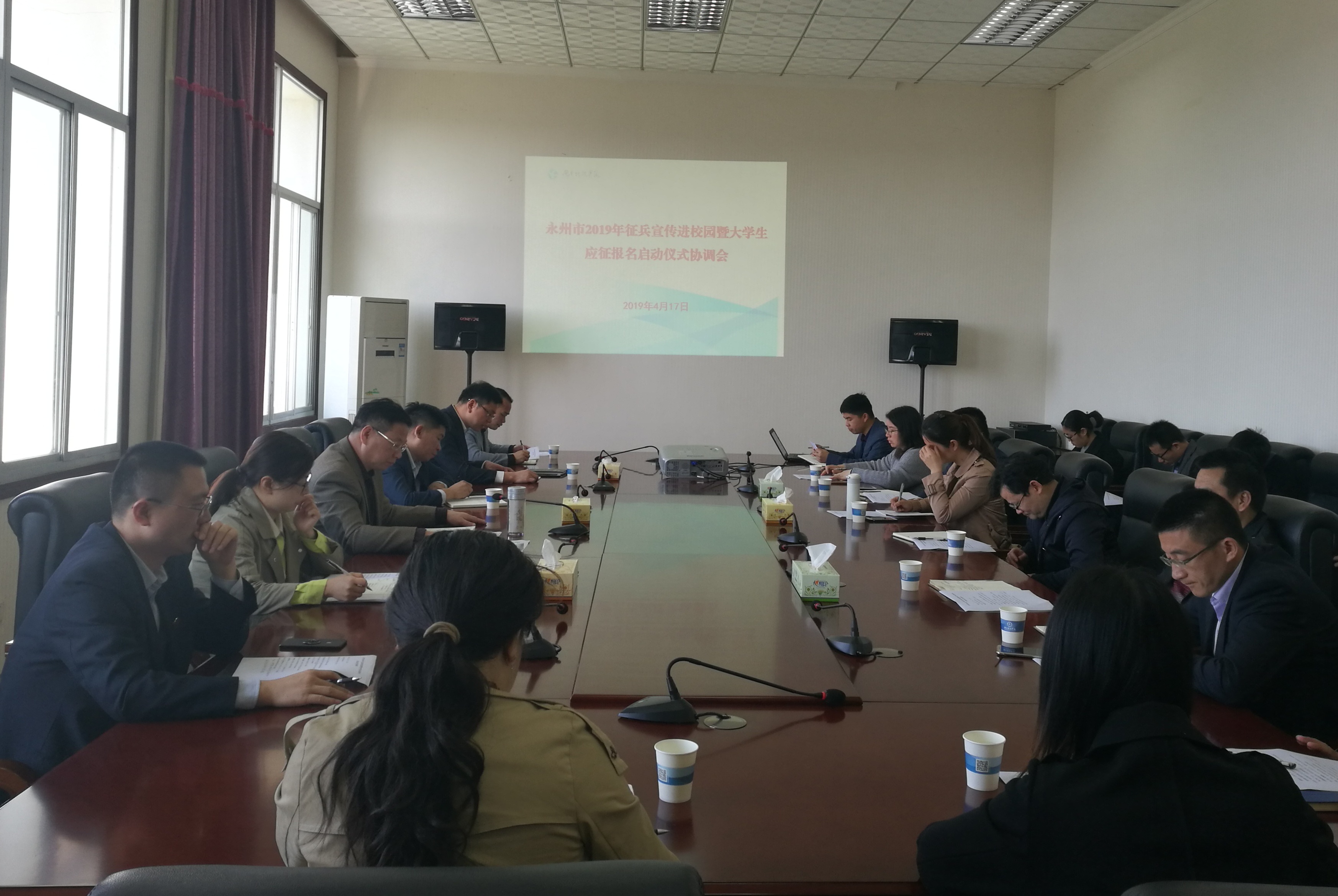 为响应上级要求,顺利开展征兵工作,4月17日,世界杯官网召开永州市2019年征兵宣传进校园暨大学生应征报名启动仪式协调会。会议由学工部、武装部部长唐华山主持,党政办公室、宣传部、保卫处、后勤服务总公司等部门主要负责人、各教学学院党总支副书记及学工部相关人员参加会议。