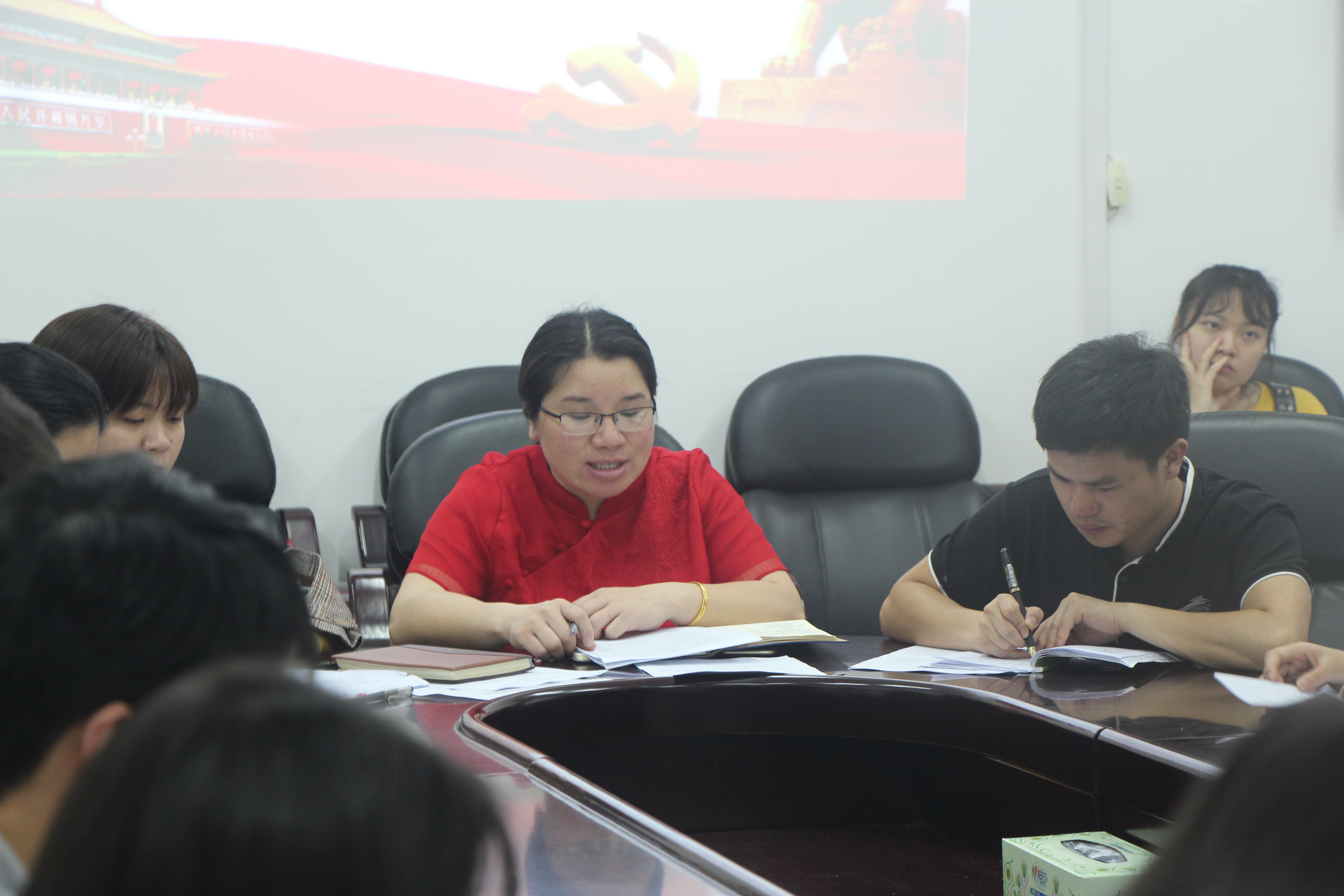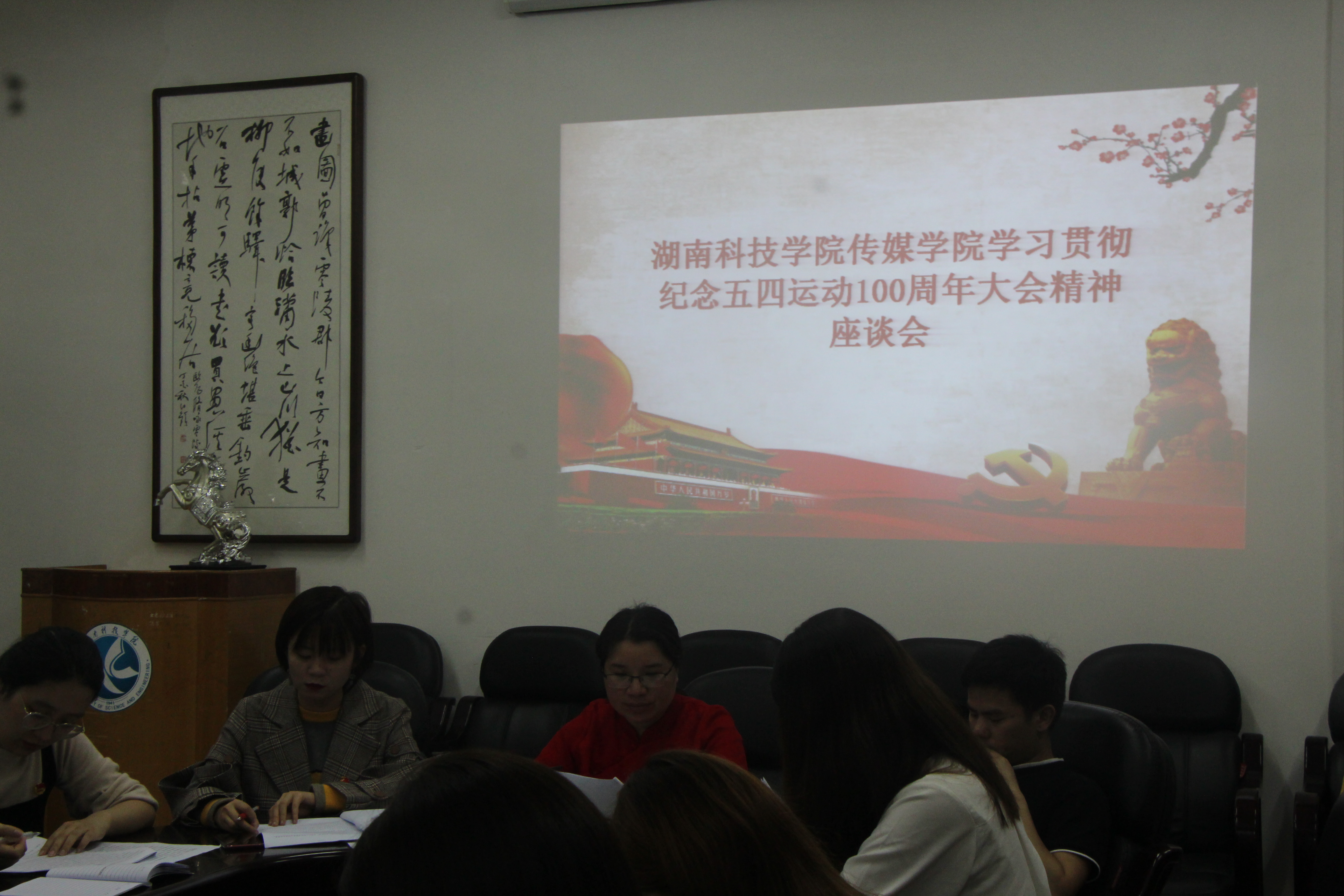 刘慧老师带领全体成员学习了习近平总书记在纪念五四运动100周年大会上的讲话精神,与大家一起缅怀了五四运动中青年的奋斗史,重点强调了讲话对新时代中国青年提出时代要求。随后,教师及学生代表进行了典型发言,易倩文老师根据自己的工作经历,提出新时代中国青年要有自己的时代担当,要把个人的发展和国家的发展联系起来,主动担当起时代赋予青年一代的历史责任。党员代表刘颖,团学干部代表易鑫惠以及学生代表陈一鹏先后发言,提出五四运动对青年一代的警示,我们青年一代要提高政治站位,不断加强学习,敢于担当时代和历史赋予的使命。