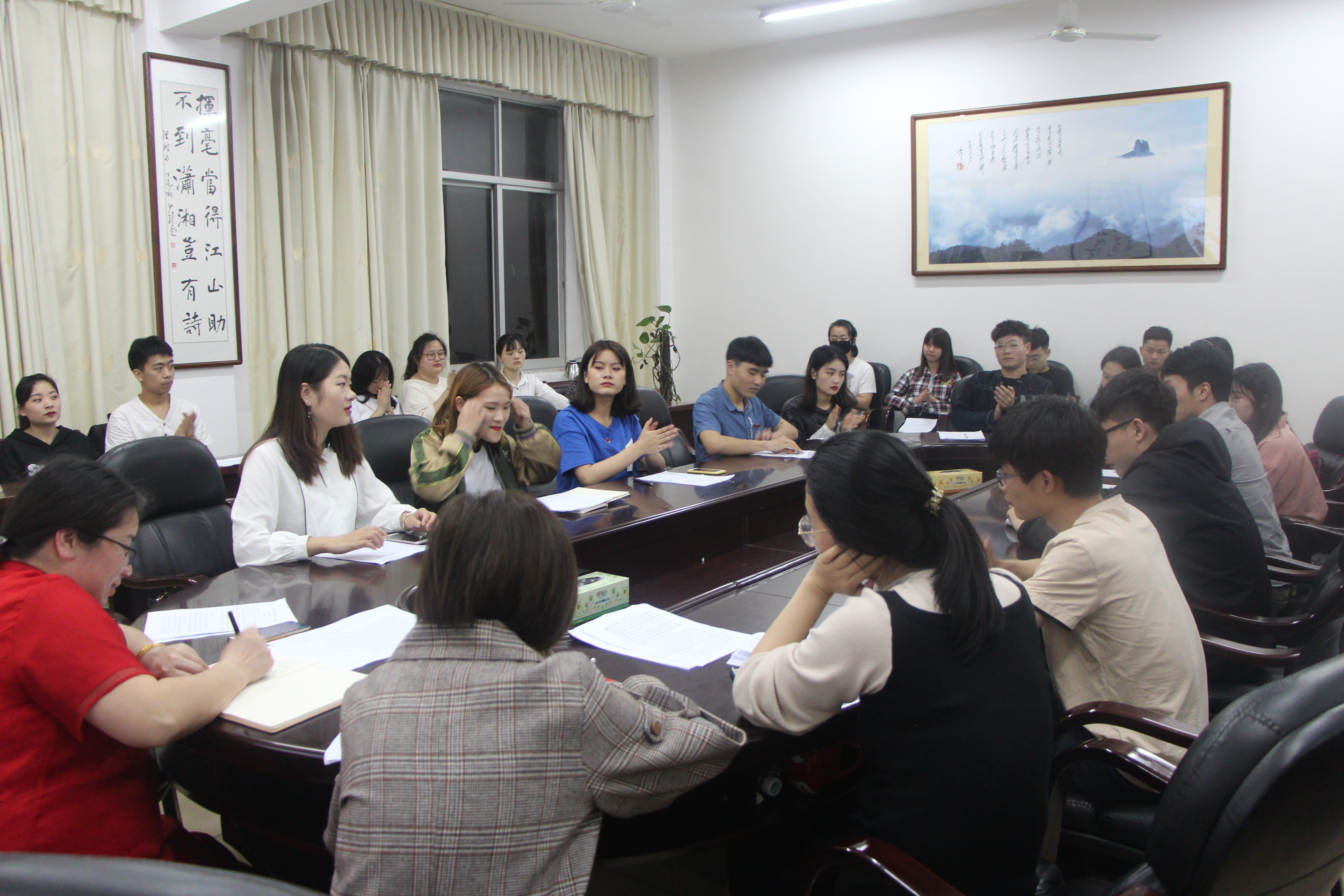 本网讯(记者杨申黎覃小明)5月10日晚,传媒学院于日新楼410教室举行学生座谈会,传媒学院党总支副书记唐华丽主持会议,全体辅导员及学生党员代表、2017、2018级保卫委员参加座谈。