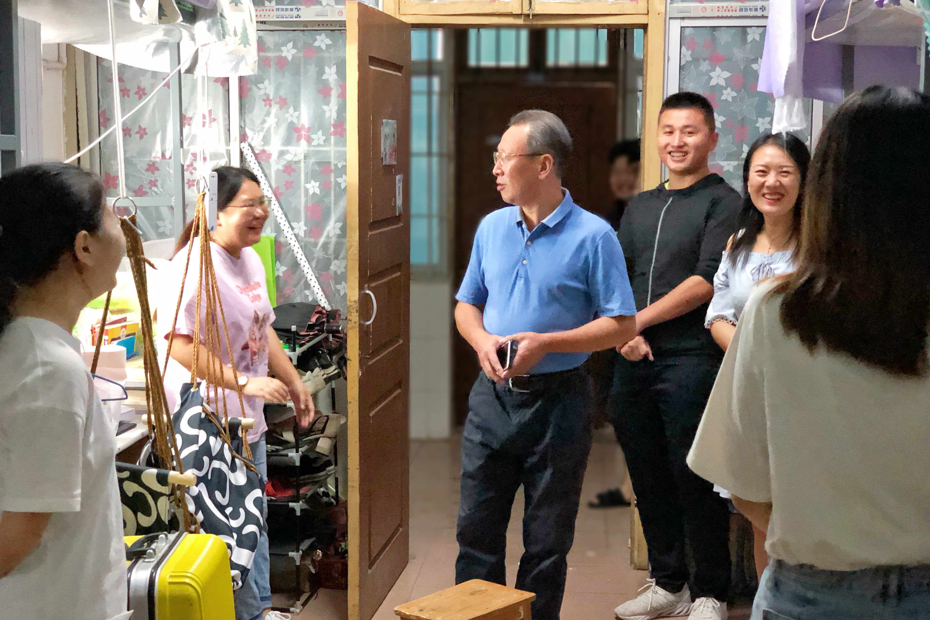 在走访中,院领导、班主任与同学们亲切交谈,详细询问他们假期的安排和入学后的感受,了解他们的住宿、生活情况,让同学们感受到来自学院的关心和家一般的温暖。在松园4栋学生宿舍,欧华恩得知李海东同学即将应征入伍,他说道:“在部队里不要害怕困难,男儿就应当有此大志,弃笔从戎,保卫祖国。”在桃园4栋学生宿舍,罗晶了解到有两名同学立志要报考研究生时,鼓励他们努力学习,并预祝考研成功。