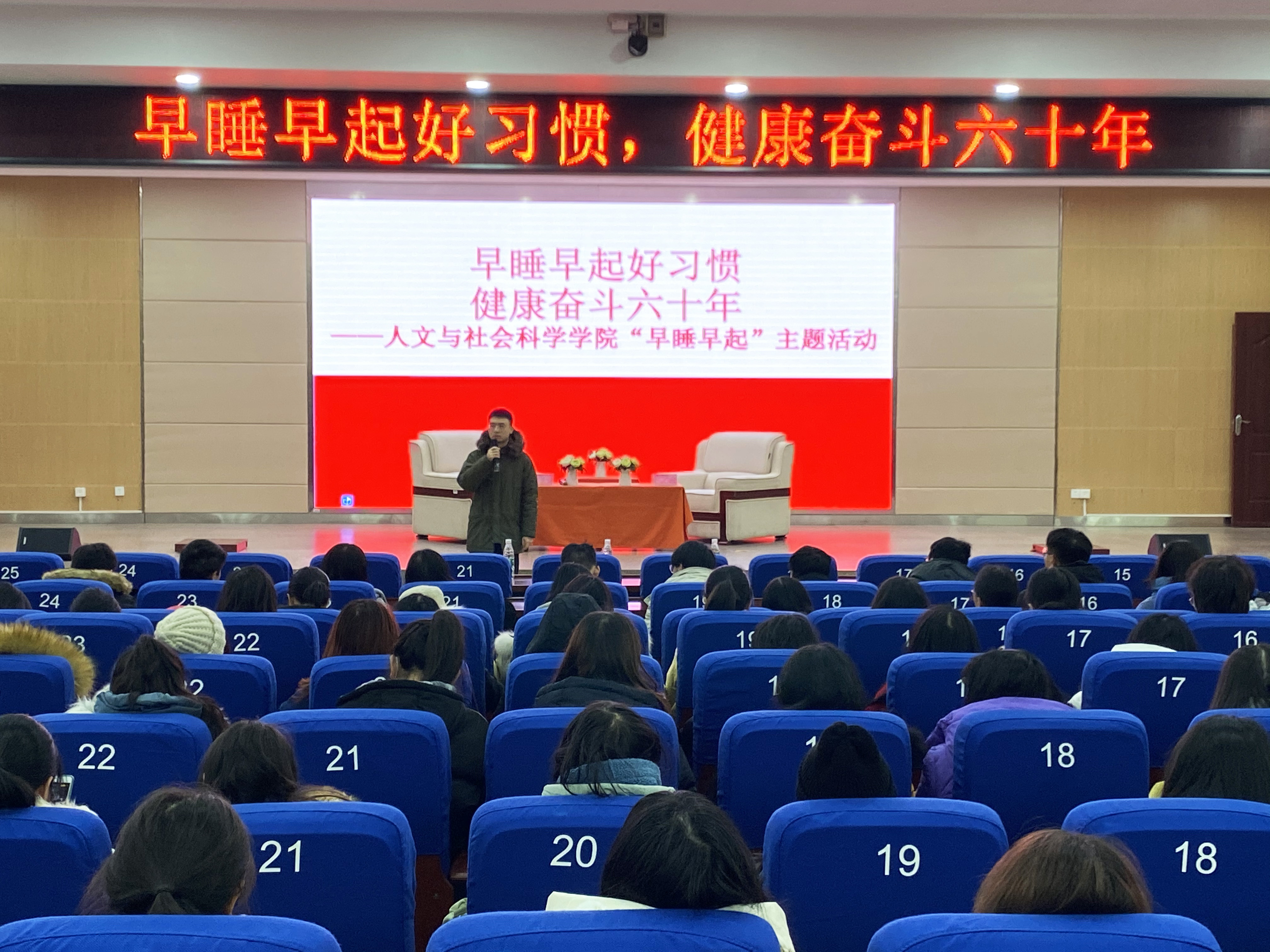 近日,为响应学校“早睡早起”号召,人文与社会科学学院在潇湘大讲堂举办了《早睡早起吃早餐,健康奋斗六十年》主题教育活动,活动由辅导员刘晨老师主持。