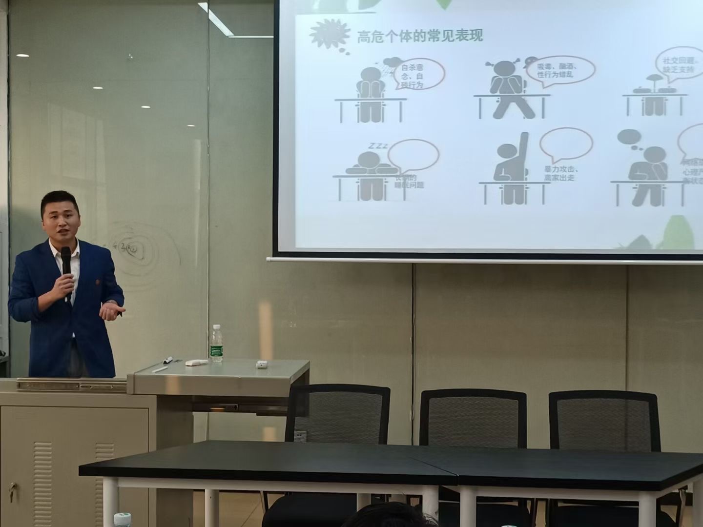 培训分两个主题,《大学生心理危机信息识别》和《大学生心理危机信息上报和处置》,主题一由申雯老师和刘罗老师主讲,主题二由涂巍老师和李媛老师主讲。