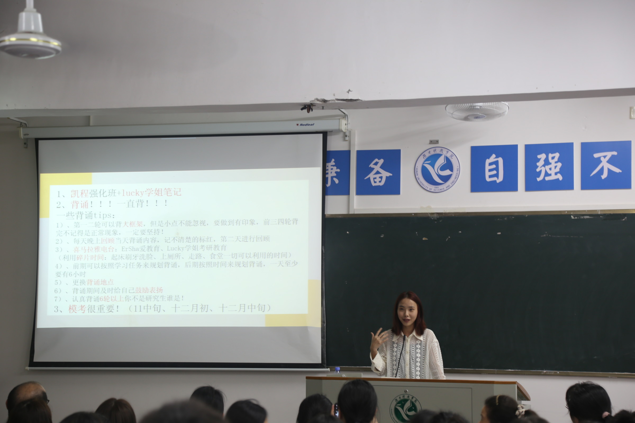 在明理楼302主会场,7名考研学生为学弟学妹集中分享了考研经验。内容涉及备考资料选择、学校选择、考试技巧、心路历程等多个方面,有备考的艰辛,有调剂的焦急,也有未能如愿的遗憾,更多是成功的喜悦和对学院帮助的感激。