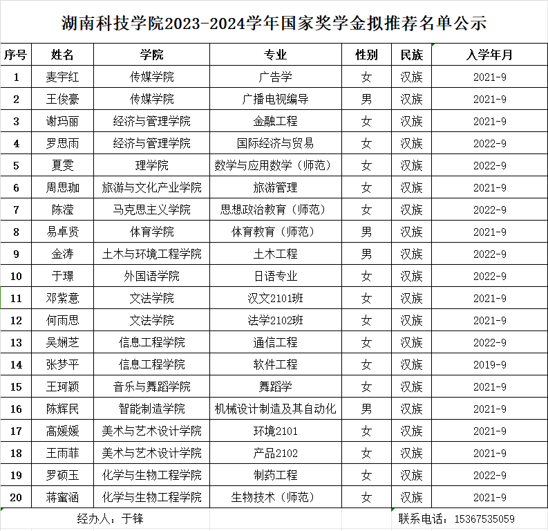根据湖南省教育厅等5部门关于印发《湖南省学生资助资金管理办法》的通知(湘财教〔2022〕13号)、湖南省学生资助管理中心《关于做好2024年普通高校国家奖助学金评审工作的通知》(湘学助〔2024〕30号)文件要求和《2026世界杯官方合作网站学生奖励办法》、《2026世界杯官方合作网站学生资助管理办法》、《2026世界杯官方合作网站国家奖学金、国家励志奖学金、国家助学金管理办法》有关规定,学工部于2024年9月25日召开资助专干会议,安排部署评奖工作。经学生个人申请,各学院初审、公示,学工部审核。拟推荐化学与生物工程学院蒋蜜涵等20名同学参评2023-2024学年国家奖学金。