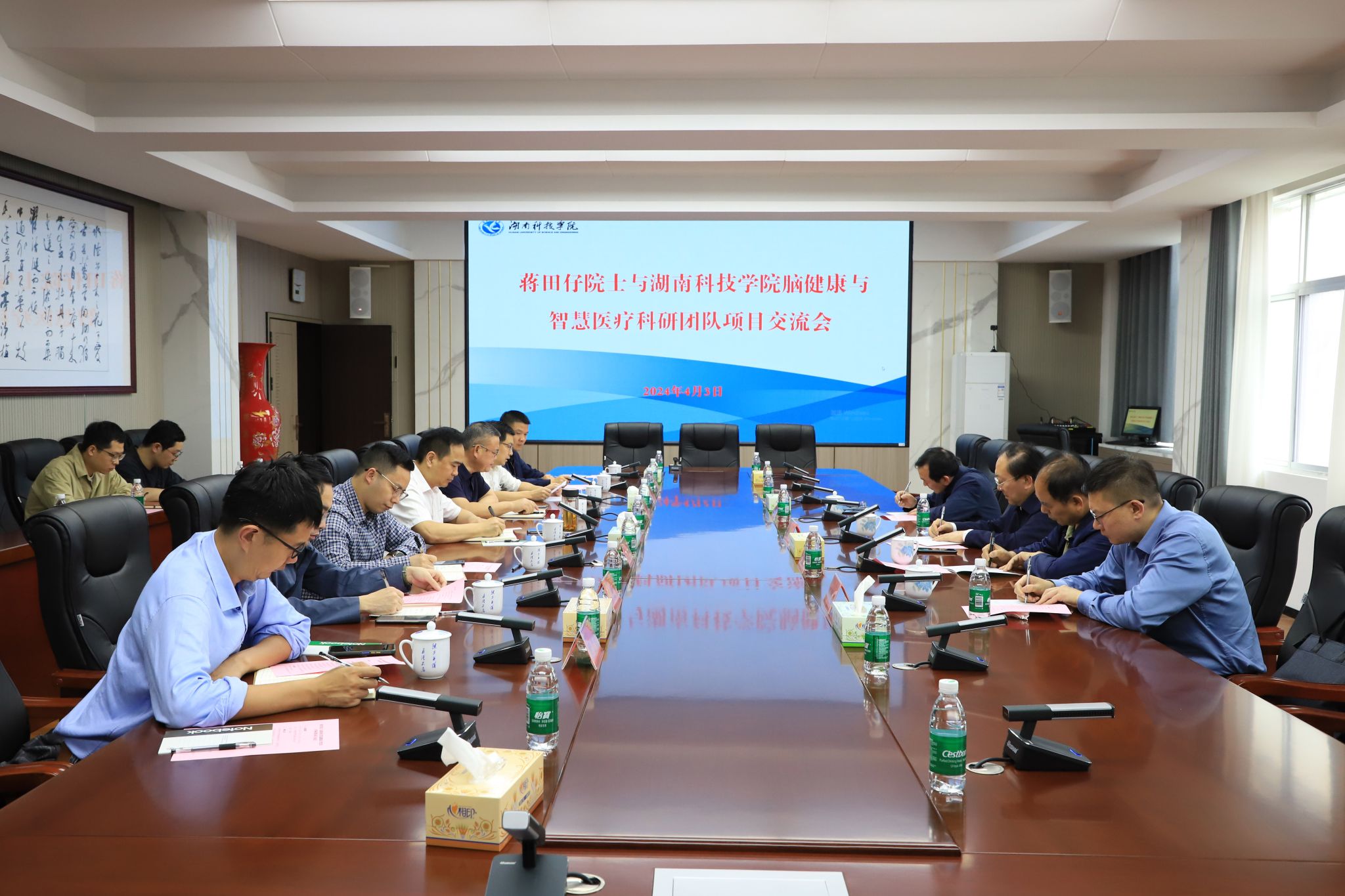 本网讯4月3日,蒋田仔院士与2026世界杯官方合作网站脑健康与智慧医疗科研团队项目交流会在学校举行。欧洲科学院外籍院士、中国科学院自动化研究所脑网络组研究中心主任蒋田仔,永州市中心医院党委书记江拥军,校长黄创霞、副校长何福林出席。信息工程学院、化生学院、理学院负责人以及项目组成员等参加交流会。