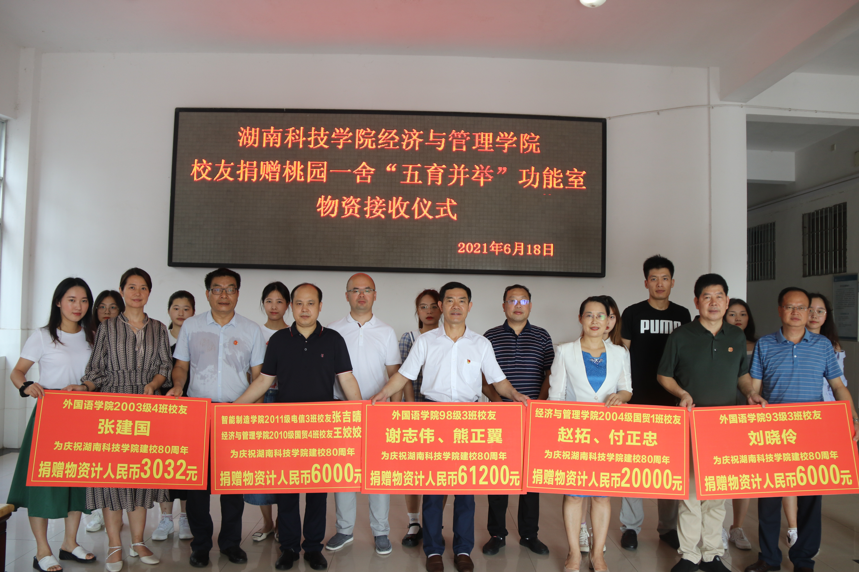 本网讯 6月18日,学校在立信楼举行校友捐赠桃园宿舍一栋“五育并举”功能室物资接收仪式,此次共有经济与管理学院、外国语学院、智能制造学院的8名优秀校友自发捐赠物资共计96232元。党委委员、副校长吴小林,副校长郑银芳出席捐赠仪式。