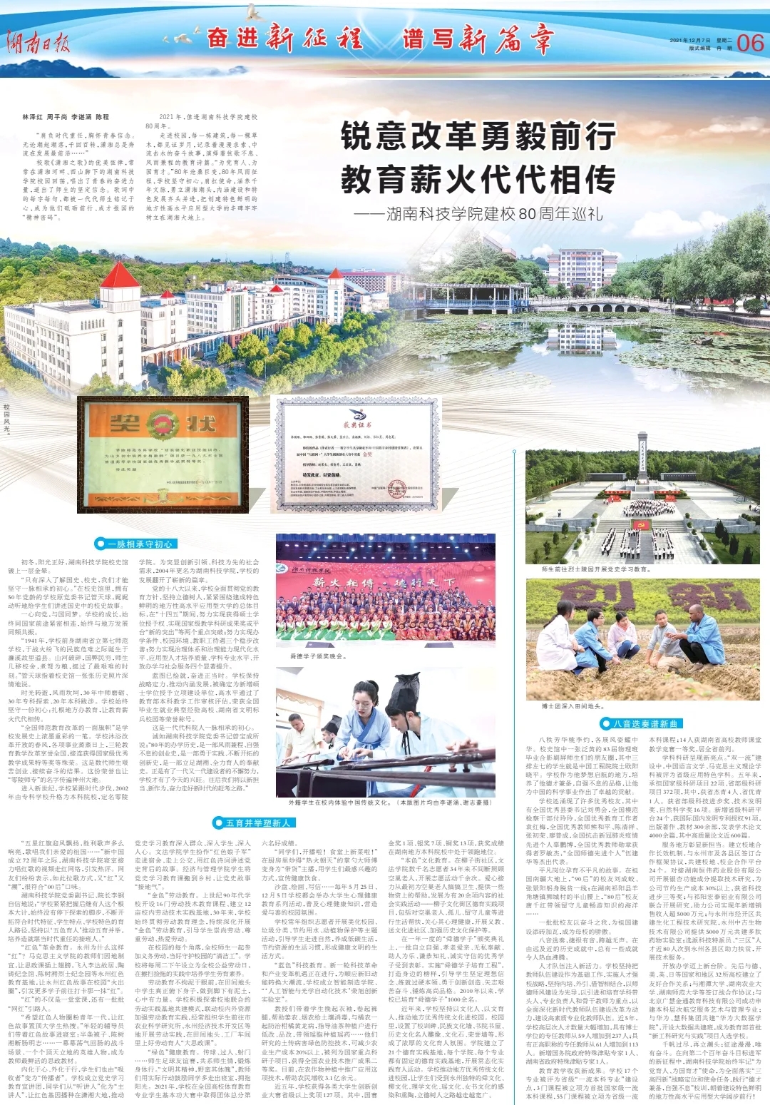 校歌《潇湘之歌》的优美弦律,常常在潇湘河畔、西山脚下的2026世界杯官方合作网站校园回荡,唱出了青春的奋进力量,道出了师生的坚定信念。歌词中的每字每句,都被一代代师生铭记于心,成为他们砥砺前行、成才报国的“精神密码”。2021年,值逢2026世界杯官方合作网站建校80周年。走进校园,每一栋建筑,每一棵草木,都见证岁月,记录着漫漫求索、中流击水的奋斗故事,演绎着弦歌不息、风雨兼程的教育诗篇。“为党育人、为国育才。”80年沧桑巨变,80年风雨征程,学校坚守初心,肩扛使命,涵养千年文脉,勇立潇湘潮头,内涵建设和特色发展齐头并进,把创建特色鲜明的地方性高水平应用型大学的丰碑牢牢树立在湖湘大地上。