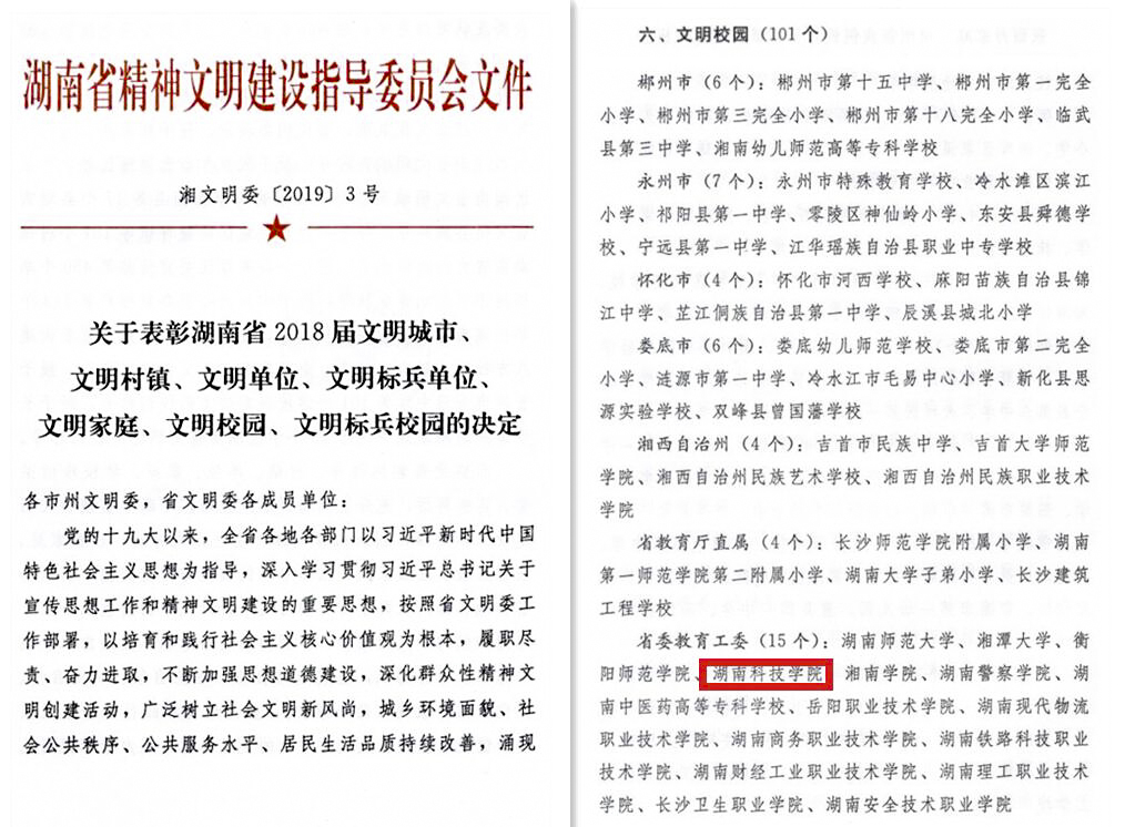 近日,湖南省精神文明建设指导委员会下发文件(湘文明委﹝2019﹞3号),世界杯官网名列其中,获评2018届“湖南省文明校园”。