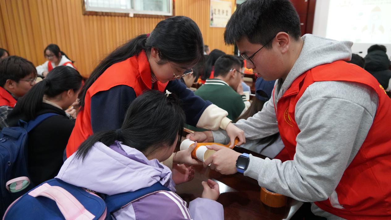 活动现场,志愿者们结合声学、流体力学等专业知识,带来趣味科创体验。通过演示声音可视化实验,让学生直观“看见”声音;分组指导学生制作马格努斯飞行器,通俗讲解科学原理;与学生结对,用环保材料共同制作动力小车并开展趣味比拼。志愿者全程耐心引导、细致讲解,现场氛围热烈。